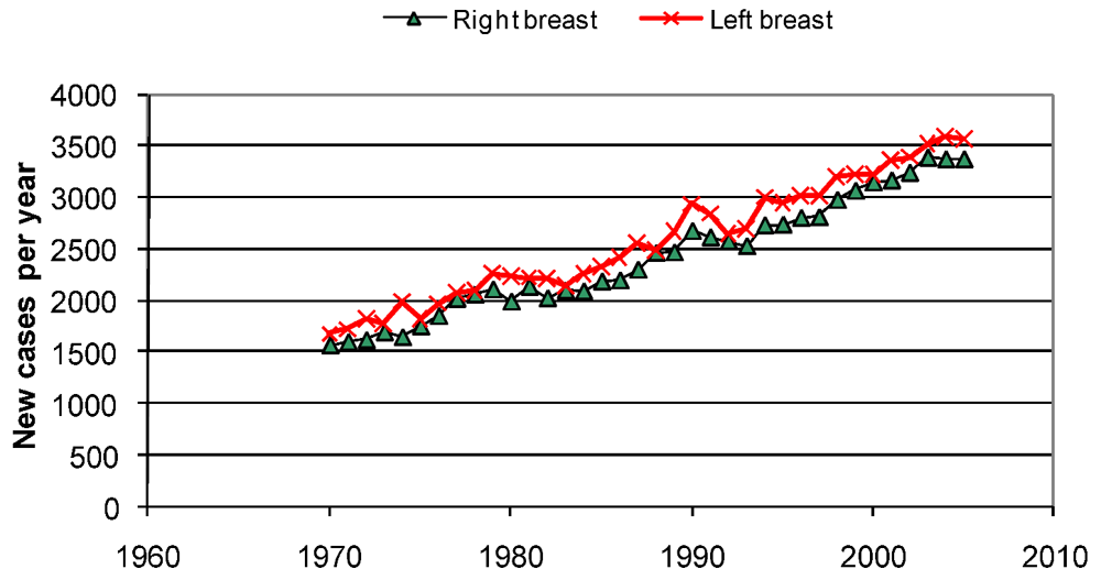 The number of new cases of breast cancer per year in Sweden shows a left dominance [13,14].