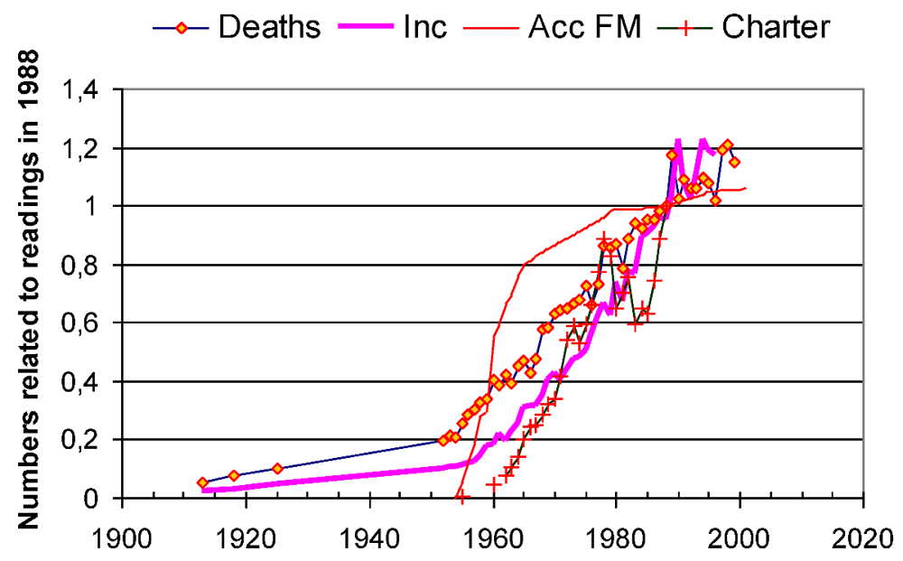 Figure 7 gives a strong indication that we should look for a cancer stimulation factor that affects both melanoma and lung cancer, and if there is such a factor, other cancer forms might also be affected. Three of the above mentioned factors; sun-tanning habits, private car use and the roll-out of public radio and TV broadcasting need to be further evaluated to see to what degree they can explain the drastic increases seen in cancer incidence and mortality.