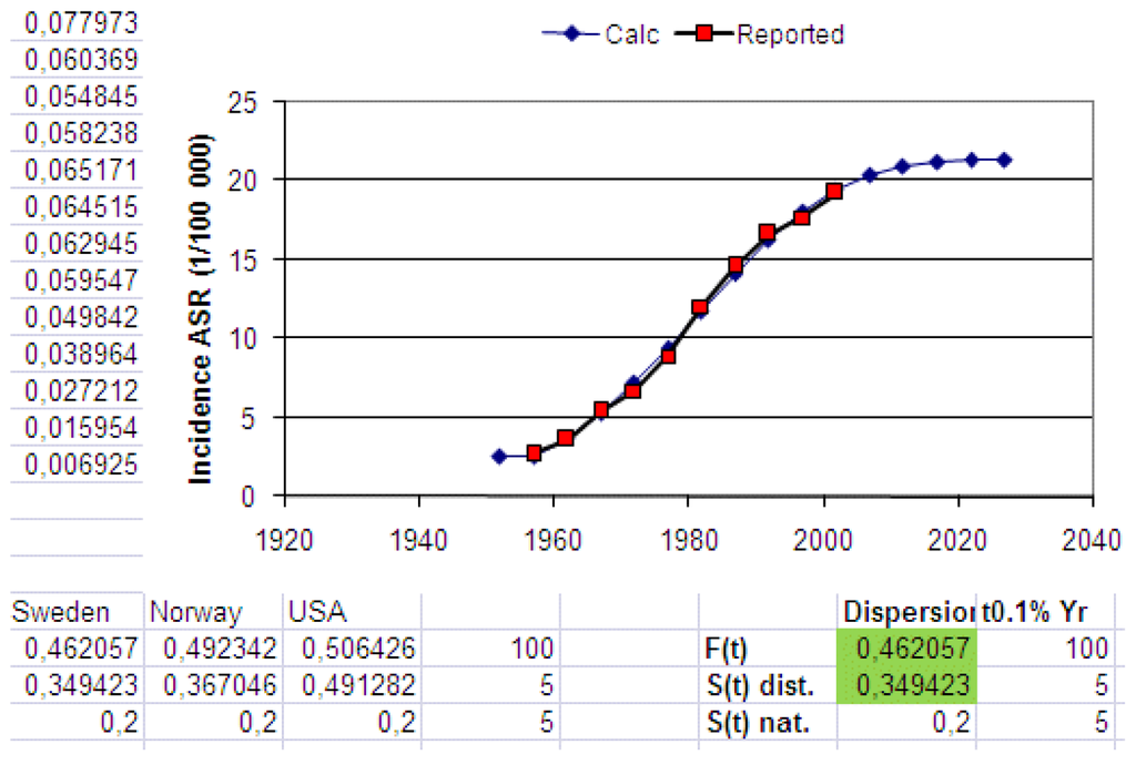 In Figure 19 the natural dispersion is set to 0.2, while the disturbed dispersion is wider (0.35) and was found by best fit optimization as also was the case for the cancer risk dispersion (0.46) for Swedish data.
