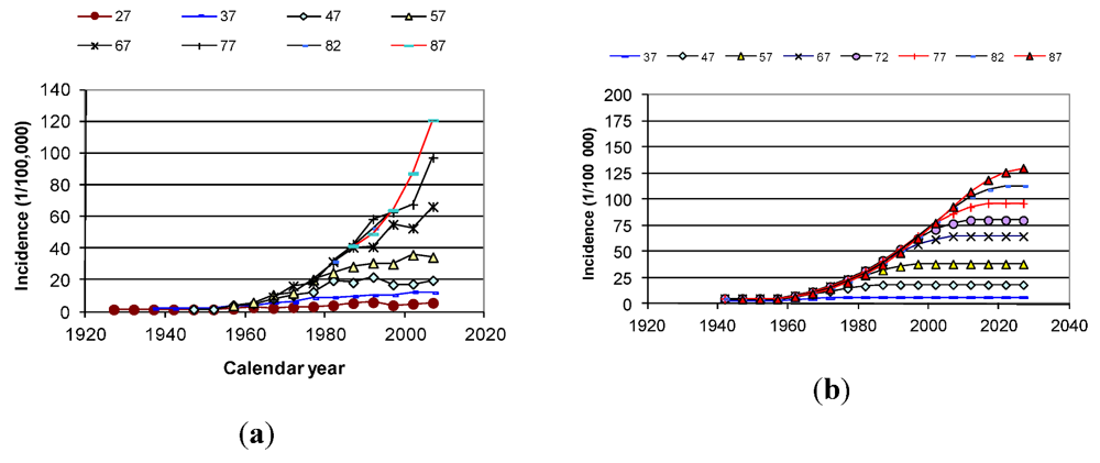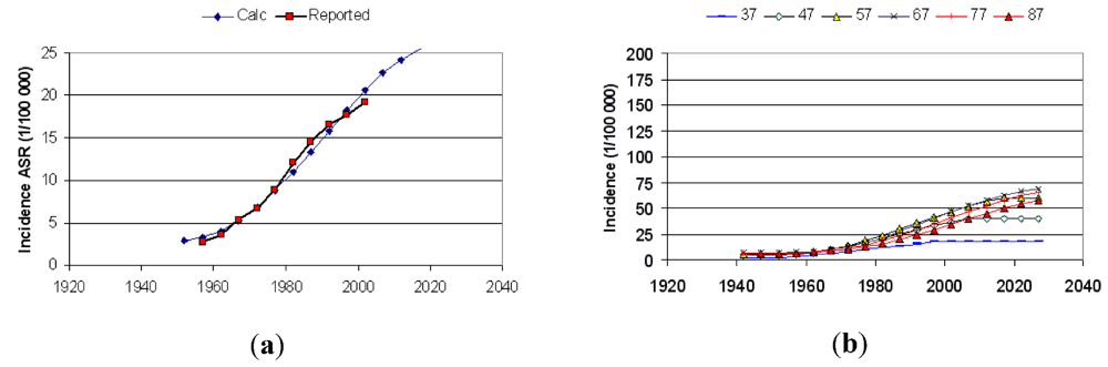 (a) Calculated and reported ASR assuming increasing skin damage rates between 1930–1980 [2]. (b) Calculated age-specific rates based on increasing sun-tanning habits [2].