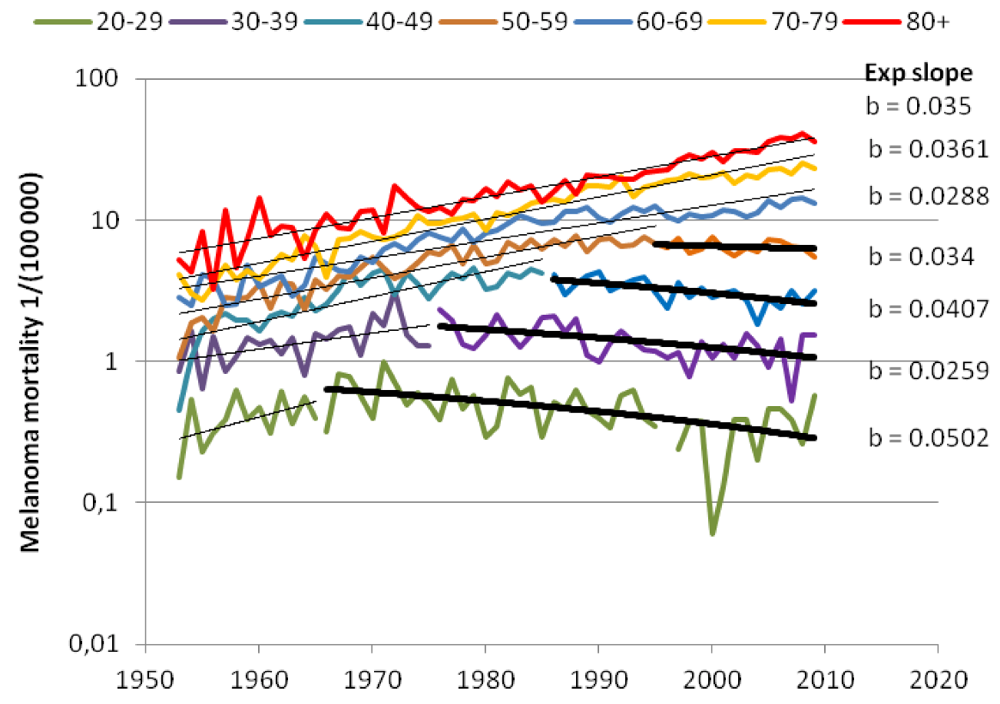 Figure 20a,b show reported and calculated age-specific melanoma incidence rates in Sweden based on the two parameters highlighted in Figure 19. The change from natural dispersion (0.2 decades) to disturbed dispersion (0.35 decades) was set to 1960. We have recently also looked at the mortality rates. It appears that the mortality from melanoma among men in the Nordic countries is exponentially increasing by the time lived as adult (>15 years of age) since 1955.