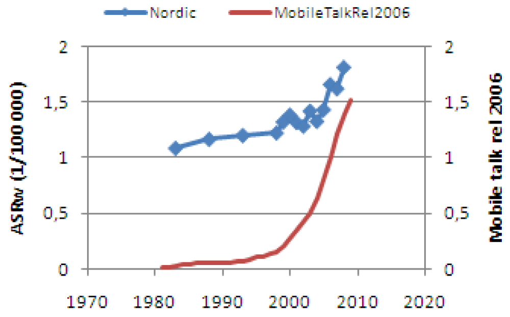 Since 2005 the incidence of melanoma in the head/face region is increasing in all Nordic countries. Since 2000 the use of mobile phones has increased by almost ten times [21].