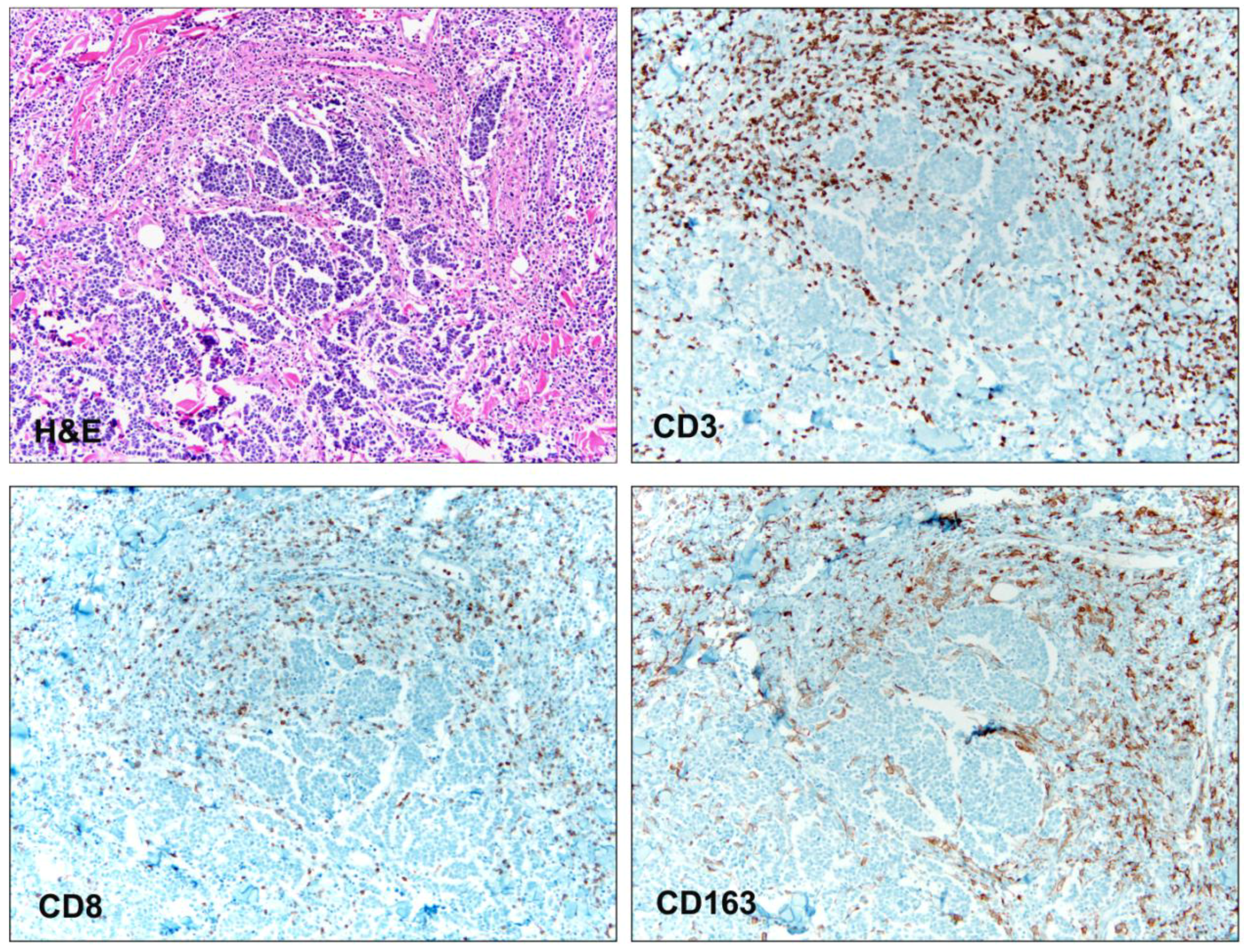 Photomicrogaphs (10× magnification) of a cutaneous Merkel cell carcinoma that is fragmented (H&E) and associated with an inflammatory infiltrate. Immunohistochemical stains reveal presence of tumor infiltrating lymphocytes (CD3, CD8) and tumor infiltrating macrophages (CD163).