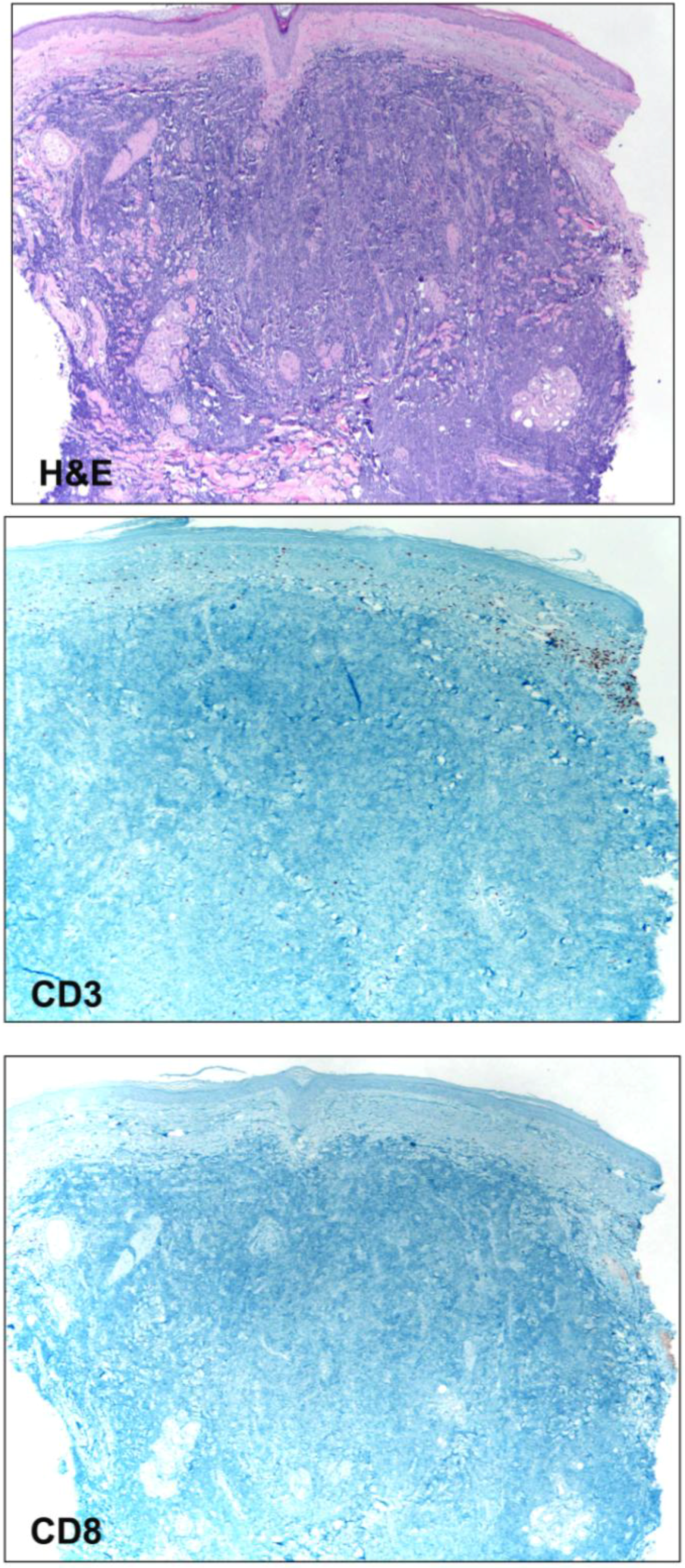Photomicrographs (4× magnification) of a cutaneous Merkel cell carcinoma displaying sheets of malignant cells (H&E) throughout the dermis. CD3 and CD8 immunostains highlight T-cells within the papillary dermis, but outside of the tumor. No intratumoral lymphocytes are present.