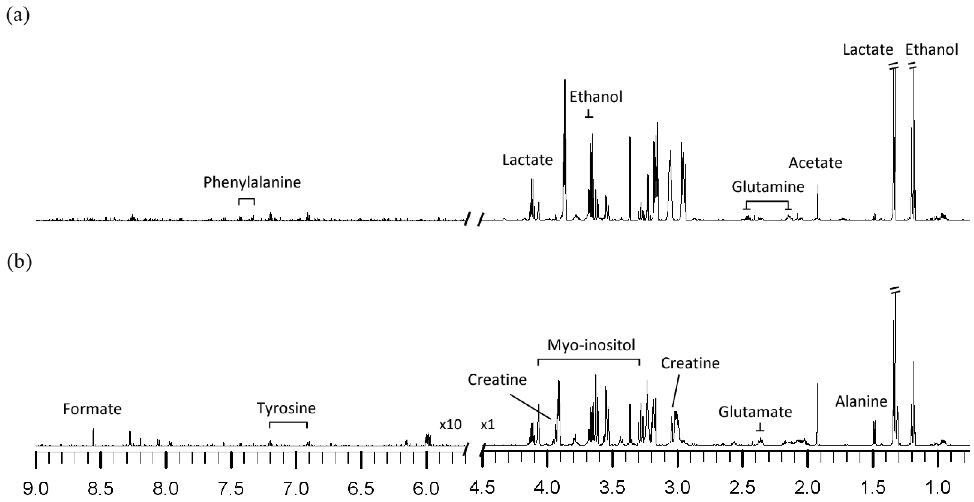 - El-Sayed, S.; Bezabeh, T.; Odlum, O.; Patel, R.; Ahing, S.; MacDonald, K.; Somorjai, R.L.; Smith, I.C.P. An ex vivo study exploring the diagnostic potential of H-1 magnetic resonance spectroscopy in squamous cell carcinoma of the head and neck region. Head Neck 2002, 24, 766–772. [Google Scholar] [CrossRef]