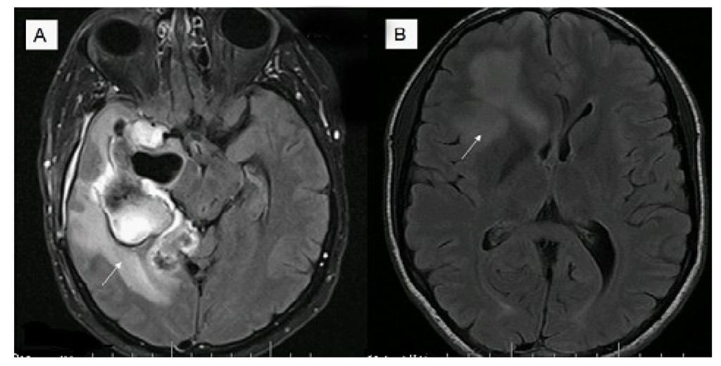 Magnetic resonance fluid attenuation inversion recovery (FLAIR) T2 imaging (A) of a 39 year old male, O(6)-methlyguanine-DNA-methyltransferase (MGMT) methylated glioblastoma (GBM) with increased edema (survival eight months post diagnosis); (B) 32 year old male, MGMT methylated GBM with less edema (alive seven years post diagnosis).