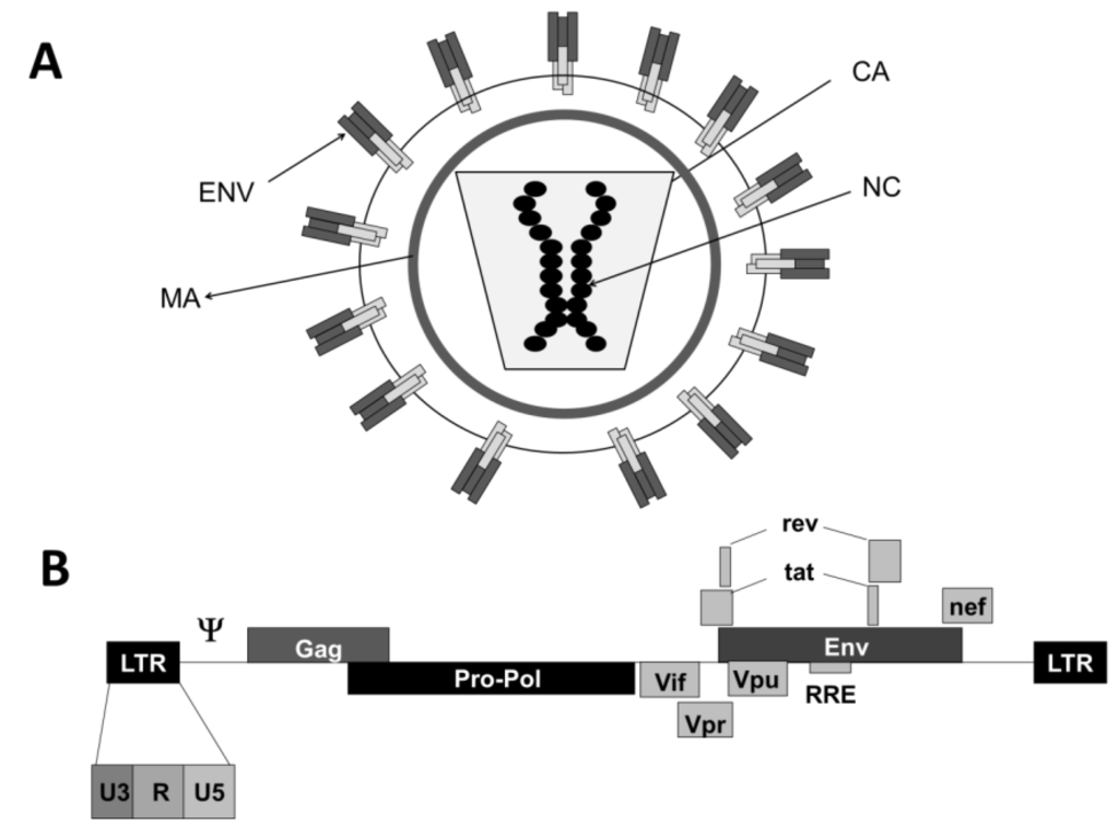 Cancer represents a significant health burden, especially in developed countries, and one of the priorities of the medical sciences is to find new and more targeted therapies. One of these strategies has utilized gene therapy techniques to enhance the natural anti-tumour activities of the immune system. Briefly, gene therapy aims at modifying the functions of cellular targets by the introduction of therapeutic genes or silencing of disease-causing genes. The overall objective for cancer immunotherapy is to enhance tumour-associated antigen (TAA) presentation to effector cytotoxic T cells, and gene therapy techniques can be used to manipulate the functions of anti-tumour effector cells. The success of gene therapy depends on the efficient, stable, and targeted incorporation as well as adequate expression of transgenes []. During the last decades several methods have been applied to deliver therapeutic/antigenic genes to increase anti-tumour immune responses [,,] and these are extensively reviewed elsewhere [,,,]. Nevertheless, a popular strategy is the use of virus-derived vectors to introduce genes of choice into target cells. From these vectors, one of the most widely used virus vector is the one based on the human immunodeficiency virus 1 (HIV-1) lentivirus.