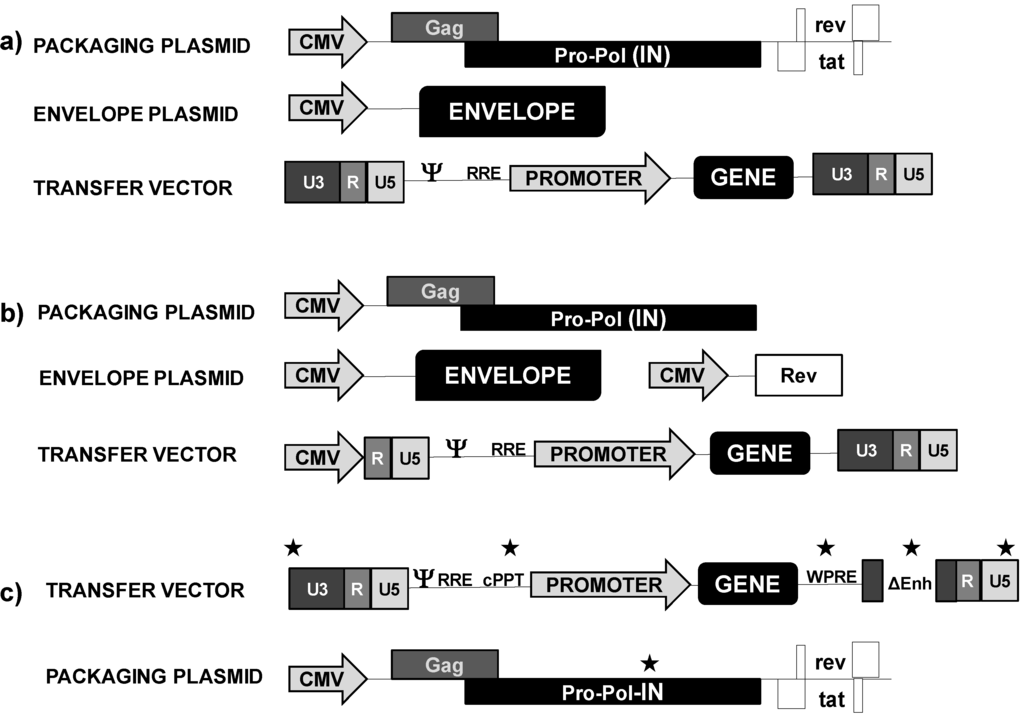 Gene therapy has moved from experimental models to its medical application quite rapidly during the last decade. The first gene therapy human clinical trials that could be considered a clinical success were performed with γ-retrovirus vectors, exemplified in the study published in 2000 by Cavazzana-Calvo []. They successfully corrected severe combined immunodeficiency (SCID)-X1 in 11 children using a mouse leukemia virus-based vector (MLV) as the gene transfer vehicle. However, the appearance of leukemia in a significant number of treated children due to insertional mutagenesis was a major setback. The integration of the therapeutic retroviral vector genome close to proto-oncogenes led to their upregulation in corrected T cells, resulting in uncontrolled T cell clonal amplification. These serious genotoxic effects were not limited to this particular clinical trial and other serious outcomes have been observed at least for the correction of chronic granulomatous disease. In recent years, lentiviral vectors (lentivectors) have been applied in human therapy replacing γ-retrovirus vectors as they seem to be less genotoxic and therefore might represent a safer option.