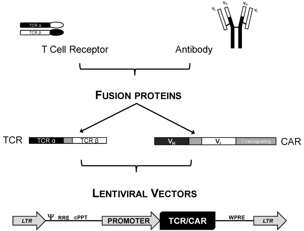 - Bobisse, S.; Zanovello, P.; Rosato, A. T-cell receptor gene transfer by lentiviral vectors in adoptive cell therapy. Expert Opin. Biol. Ther. 2007, 7, 893–906. [Google Scholar] [CrossRef]
