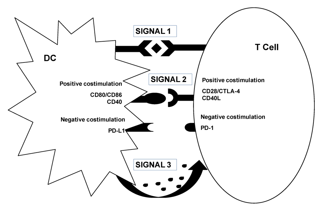 While CTLs represent important targets for cancer immunotherapy, professional APCs such as DCs are key regulators of immunity, including the activation and expansion of antigen-specific T cells. As DCs are the key APCs that regulate both immunity and tolerance they represent an exceptionally good target for immunotherapy []. DCs are especially efficient at antigen uptake, processing, and presentation in MHC class I and class II molecules to T cells. Once DCs have taken up and processed antigens, particularly in the context of inflammation, they undergo maturation by up-regulating co-stimulatory molecules and secretion of strong pro-inflammatory cytokines and chemokines. Maturing DCs migrate to secondary lymphoid organs such as draining lymph nodes, where they stimulate naïve and antigen-experienced T cells. According to the “three signal hypothesis”, T cells need to receive three activatory signals during antigen presentation. DCs are particularly efficient at providing these three signals for the induction of potent T cell responses [] (Figure 5). The first signal is the recognition of the peptide-MHC complex by the TCR but this signal is not sufficient for effector T cell induction. The second signal is the integration of a wide variety of signals derived from the interaction of positive and negative co-stimulatory molecules on the surface of DCs with their corresponding ligands on T cells. An example for a co-stimulatory interaction is the binding of CD80 with its ligand CD28 on DCs and T cells, respectively, and a co-inhibitory interaction could be provided by the binding between CD80 to CTLA-4 or PD-L1 to PD-1 []. The integration of positive and negative co-stimulatory signals determines whether the T cell will get activated and to what degree, or whether it will undergo anergy, apoptosis, or regulatory T cell differentiation. The third signal determines the type of T cell response and is induced by the combination of cytokines present during antigen presentation, particularly those that the DC secretes in the immunological synapse []. DCs modified with lentivectors can effectively provide these three signals; an encoded antigen of interest and selected immunomodulatory genes that can modify the maturation phenotype of DCs and induce pro-inflammatory cytokine secretion []. This is the case for NF-kB or p38 activators [,,,]. This is key for cancer immunotherapy, as a strong CD8 response is desired. The expressed transgene is readily processed by transduced DCs and the peptides loaded onto MHCI and II molecules. Including the whole transgene within the lentivector vaccine rather than peptides ensures that the corresponding correct peptide antigens are loaded without the need of designing them for specific MHC genotypes [].
