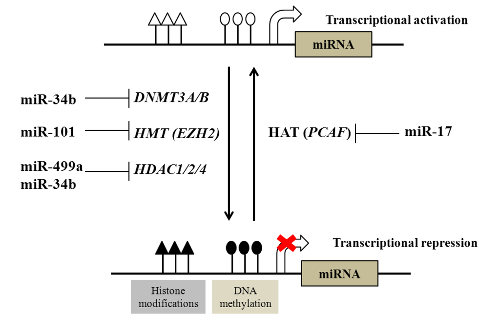 Interactions of DNA/histone modification and miRNA. Epigenetic regulatory mechanisms such as DNA methylation (controlled by DNMTs) and histone modifications modulate epigenetic states and transcriptional responsiveness of both mRNA and miRNA target genes. These actions are controlled by antagonistic classes of enzymes, for example by histone deacetylases (HDACs) and histone acetyl transfereases (HATs). There is good evidence for control of their expression by miRNA. For example, miR-101 targets include EZH2 [71] and miR-499a targets include HDAC1 [72], whereas the HAT (p300/CBP-associated factor (PCAF)) is targeted by miR-17-5p [73].