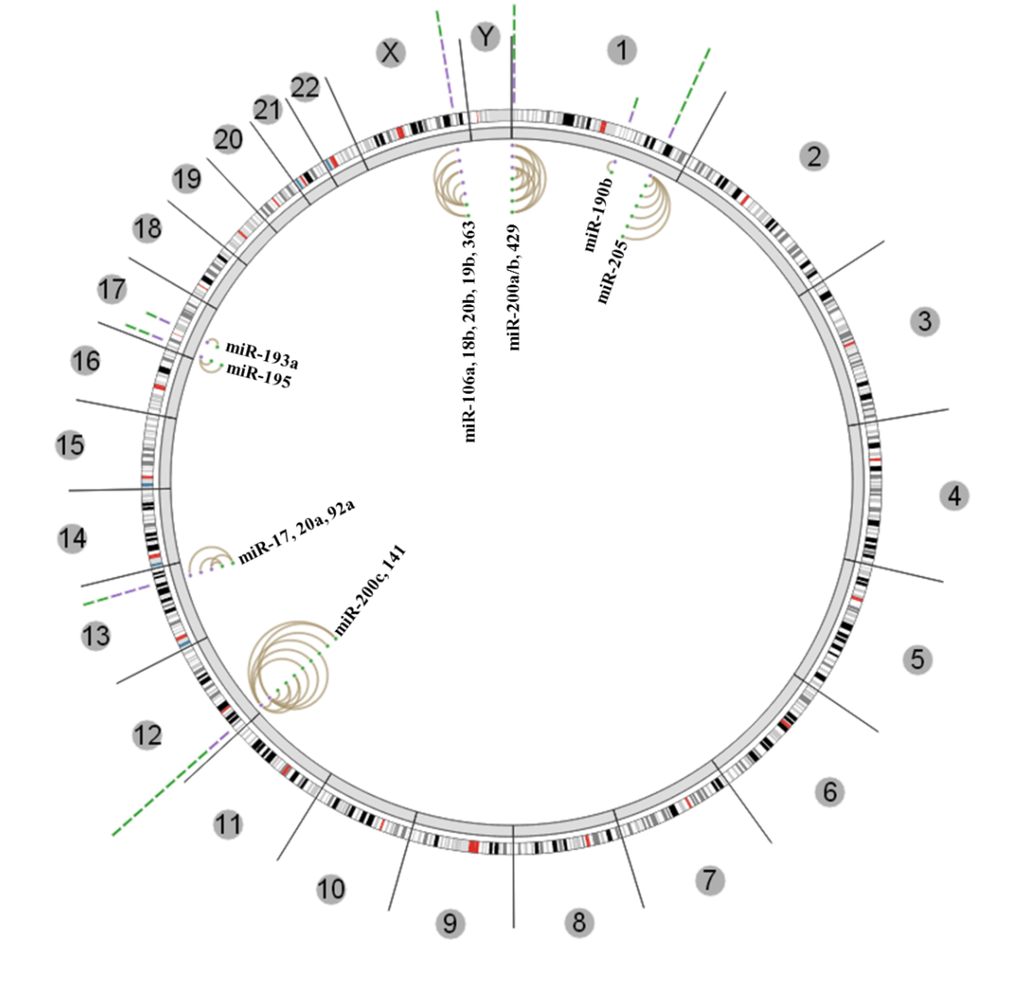 Significant negative correlation between altered miRNA expression and DNA methylation pattern in primary prostate cancer tumors from the TCGA data-set. Circos plot showing miRNAs where there is a significant correlation with CpGs near miRNA gene locations. Outer ring represents all the chromosomes. MiRNA genes are represented by purple lines near their chromosomal locations. Green lines represent CpGs in the region. Lines connecting two dots represent the statistically significant correlation between two features selected, miRNA expression and CpG methylation in this case. (Figures generated from [125] using latest version of data release for Prostate cancer “PRAD-13-March-2013”).