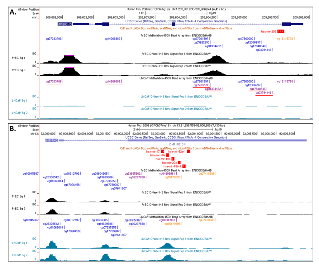 UCSC genome browser tracks showing CpG methylation and DNase I cleavage status around miRNAs. Top panel track shows the genomic location of the miRNA. Middle track shows the CpGs in genomic fragment and color of each CpG represent the beta values (ENCODE description—Orange, beta value equal to or greater than 0.6 was considered fully methylated; Purple, Beta values between 0.2 and 0.6 were considered to be partially methylated; Blue, beta value equal to or less than 0.2 was considered to be fully unmethylated). Bottom panel shows the DNaseI sensitivity measured in PrEC (black) and LNCaP (blue). DNaseI hypersensitive sites shown as peaks suggest accessible chromatin; conversely no DNaseI hypersensitive sites suggest closed chromatin. (A) Shows the status of miR-205. Most of the CpGs around miR-205 are partially methylated in LNCaP and un-methylated in PrEC. Supportively, DNaseI sensitivity shows open areas in PrEC cells and closed chromatin in LNCaP and. (B) Shows the status of a miR-17-92 cluster. Two CpGs around this cluster are partially methylated in PrEC cells and un-methylated in LNCaP. Supportively, DNaseI sensitivity shows open chromatin in LNCaP and closed in PrEC cells. Differentially methylated CpGs are underlined.