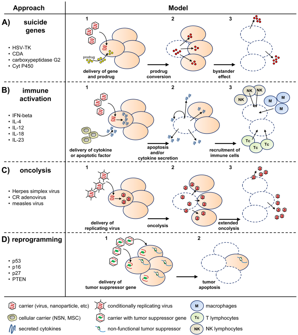 Despite being a genetic disease, the possibility of applying strict gene therapy for cancer is less straightforward since tumors develop through multiple known and unknown genetic abnormalities. Moreover, the accumulation of mutations and evolution of the tumor’s genetic makeup during malignant progression make cancers a genetic moving target that would defeat the single gene-replacement approach. Therefore, the concept of gene therapy for cancer has been widened to encompass the general delivery of therapeutic genetic material to the tumor, to kill cancer cells or enhance the immune response against them.