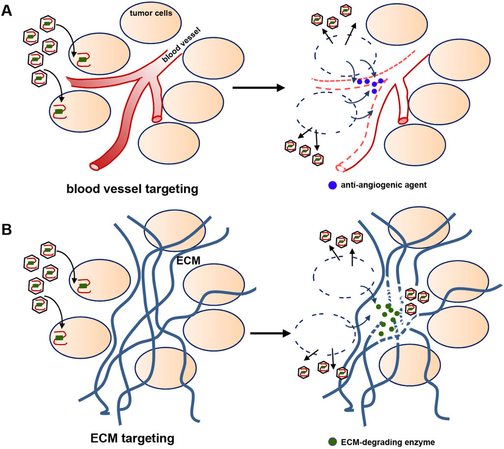 The gene-delivery strategies described in the previous sections (as well as viral-mediated oncolysis, in the following section) target specifically the tumor cells for immediate cell death. Additional effects such as reduced tumor vascularization and invasion may be observed (and welcomed) but are not usually part of the design rationale. However, viruses can also be engineered to deliver genes that specifically affect the tumor microenvironment. Two clear examples of this strategy are viruses carrying anti-angiogenic genes or genes that remodel the tumor extracellular matrix (as illustrated in Figure 2).