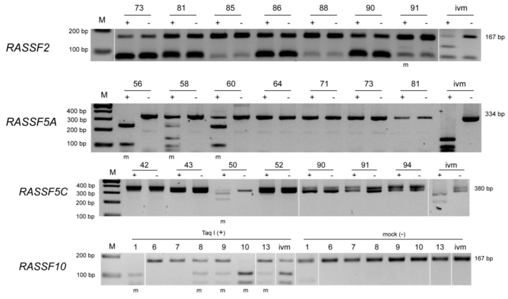 - Endoh, M.; Tamura, G.; Honda, T.; Homma, N.; Terashima, M.; Nishizuka, S.; Motoyama, T. RASSF2, a potential tumour suppressor, is silenced by CpG island hypermethylation in gastric cancer. Br. J. Cancer 2005, 93, 1395–1399. [Google Scholar] [CrossRef]