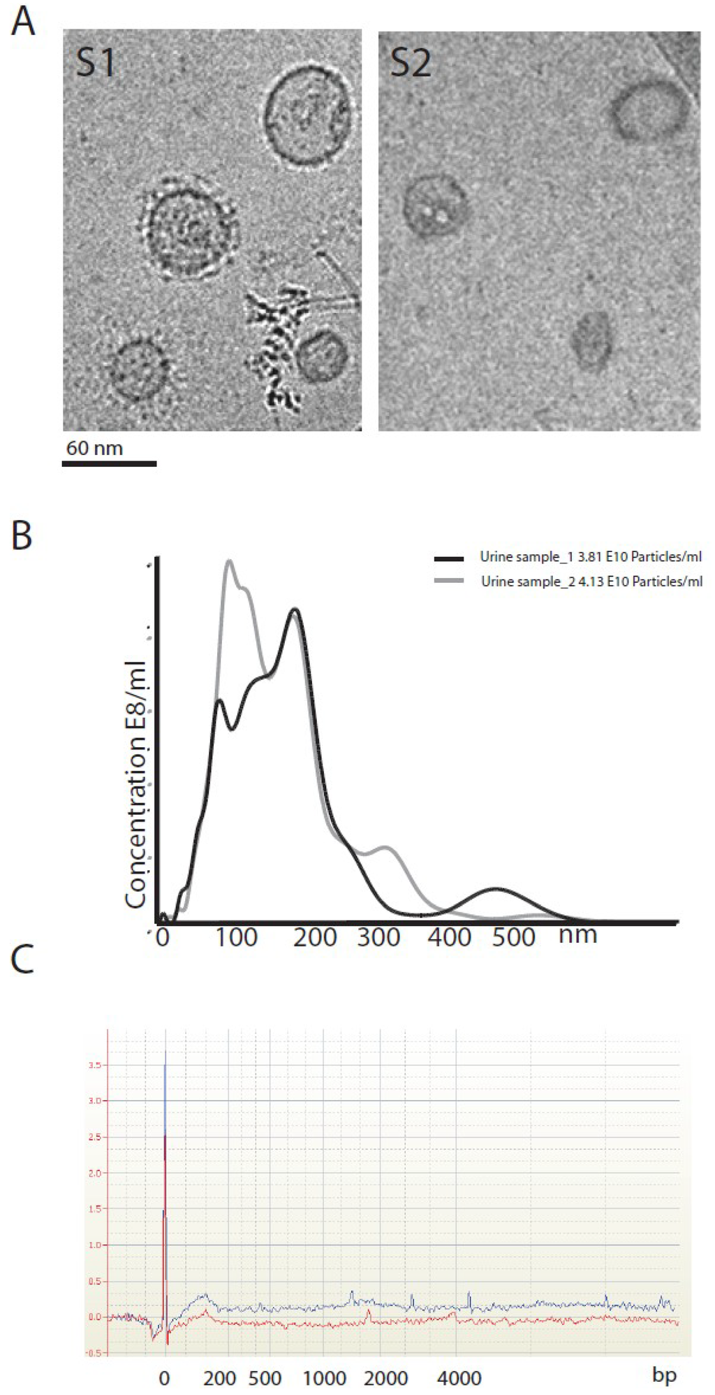 Characterization of EVs isolated from voided urine. Two different samples observed by electron microscopy image (A), size profile determined by NTA (B) and the RNA profile after RNA extraction from EVs (C).