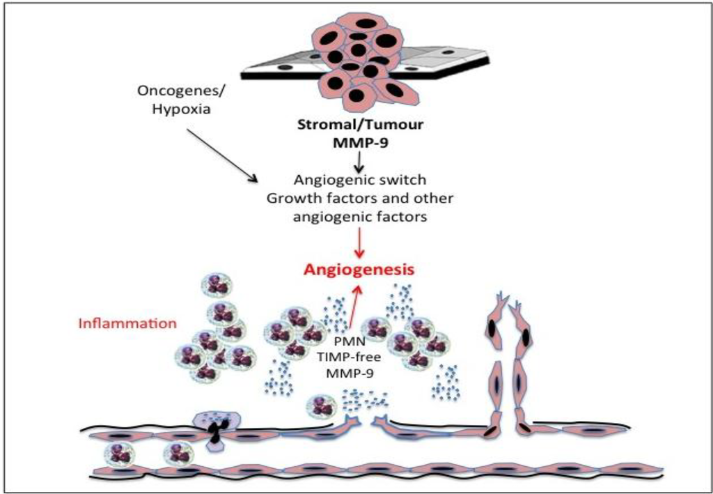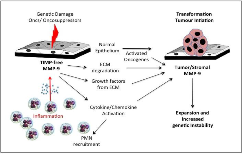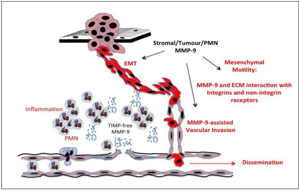In the present article, following a briefly description of the human gelatinase B/MMP-9 gene, protein and mechanisms that regulate its expression, activation and activity, we review current concepts concerning gelatinase B/MMP-9 involvement in tumour progression, starting with the genetic damage that results in transformation and accompanies tumorigenicity, neoplastic expansion and the accumulation of mutations, increased survival, tumour-associated angiogenesis, adhesive interactions, matrix degradation and the loss of basement membrane, tumour cell invasion, motility, intravasation and extravasation, evasion of immunological surveillance, and regulation of the cancer stem cell and metastatic niches. We also review tumour-associated mechanisms that alter the equilibrium between gelatinase B/MMP-9 and its inhibitors and address novel ways to inhibit gelatinase B/MMP-9 involvement in tumour progression.