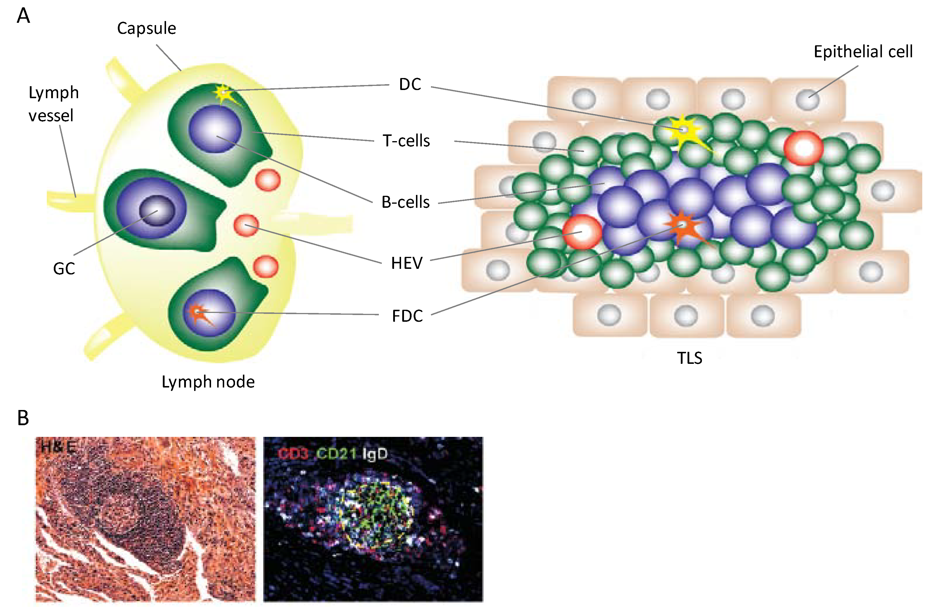 Histological similarities and structural differences between lymph nodes and TLS. (A) Both lymph nodes and TLS contain the same cell populations and high endothelial venules (HEV). On the left, a schematic of lymph node structure highlighting B and T cell zones is shown. Each zone contains resident cell populations that upon antigen presentation by follicular dendritic cells (FDC) or DC, and subsequent activation, undergo clonal expansion. Expanded B cell populations form a germinal center (GC). On the right, a TLS schematic showing individual cells aggregating which mimics lymph node histological structure is shown. B cells in this case will also clonally expand and form germinal centers after antigenic stimulation. Structural differences are highlighted; lymph nodes are encapsulated and connected to the lymphatic system via afferent and efferent lymph vessels while a TLS forms within a chronically-inflamed tissue and lymph vessel formation may eventually occur [6]; (B) Tissue specimen of TLS structures seen in tuberculosis infection. The left is an H&E stain; the right is an immunoflourescence image staining for CD3+ T cells and CD21+IgD+ B cells [7].