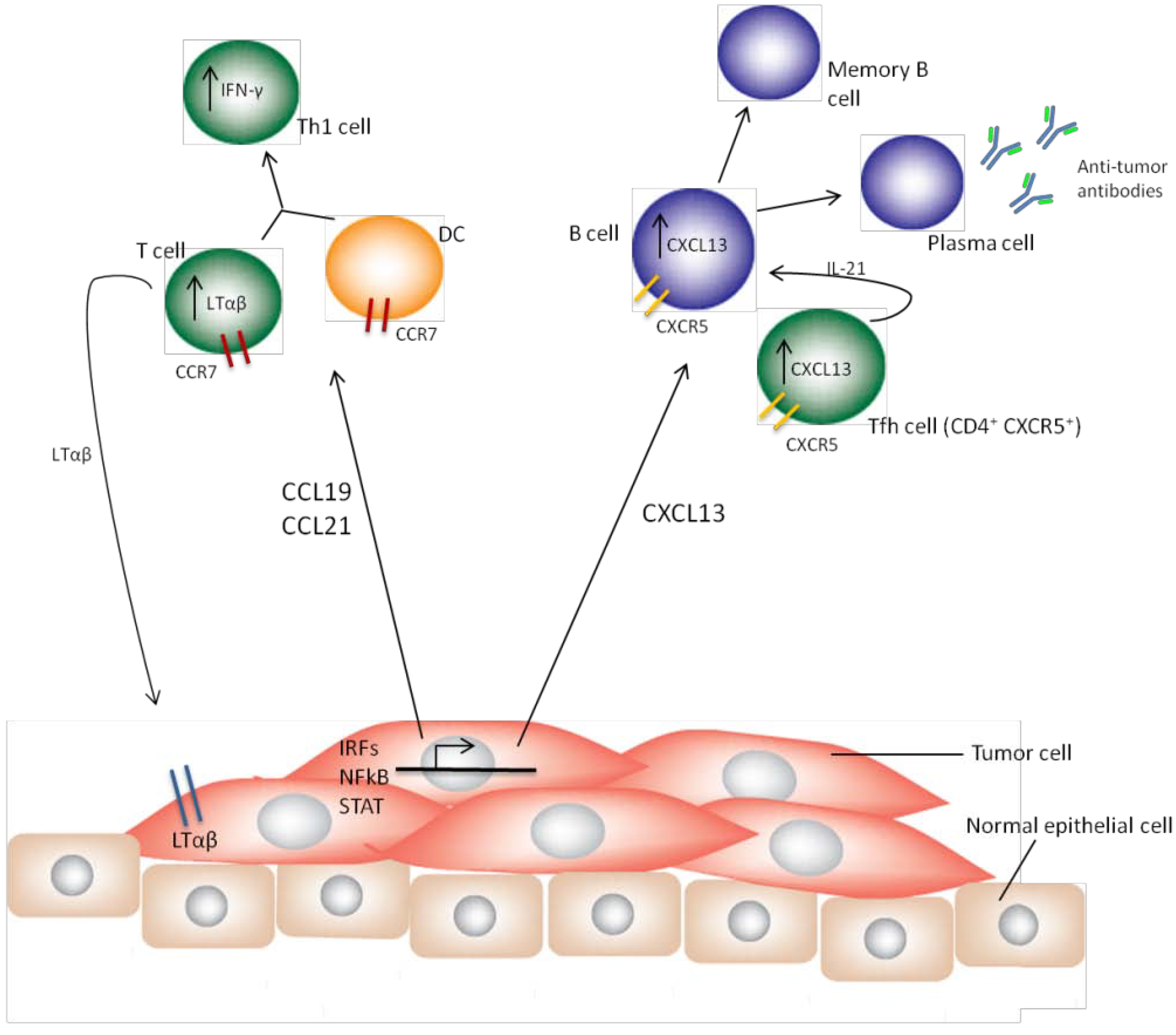 In summary, factors regulating TLS formation in epithelial tissues, such as the chemokines CCL19, CCL21 and CXCL13, and the cytokine LTαβ, most likely also contribute to an anti-tumor immune response in several carcinomas/adenocarcinomas. What remains to be clearly elucidated are (1) whether the tumor cell itself is responsible for expression, or lack thereof, of these critical factors or their upstream regulators (e.g., IRFs, STATs and NF-κB); (2) the immune deficits present in each individual cancer type that result after dysregulation of CCL19, CCL21, CXCL13 and LTαβ expression and/or signaling; and (3) how immunotherapy treatment either alone or in conjunction with current chemotherapy can be used to manipulate the tumor immune environment to re-activate an anti-tumor response.