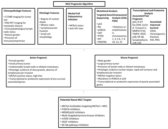 Although MCC prognosis is on average quite poor, there is considerable range in survival, yet we have limited capacity to predict outcome. Most studies on survival in MCC have historically focused on clinicopathologic features including tumor size and location, histologic features such as nuclear atypia and lymphovascular invasion, and metastases to lymph nodes and distant sites. However, with advances in molecular diagnostics, characterization of MCC signatures will provide better accuracy for predicting prognosis in the individual patient. There are already multiple studies correlating expression of one or several genes with prognosis in MCC, typically via protein expression using immunohistochemistry (IHC), and the information from these resources could be synthesized to create a prognostic molecular profile (Table 4). MCPyV status may also be an important bifurcation, as virus negative tumors have been shown to have worse prognosis in some series (Figure 1) [32,39].