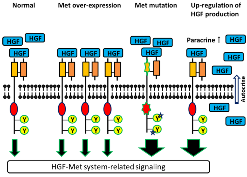 In cancer, HGF-Met signaling is up-regulated by various systems, including over-expression or mutation of Met and increased HGF production.