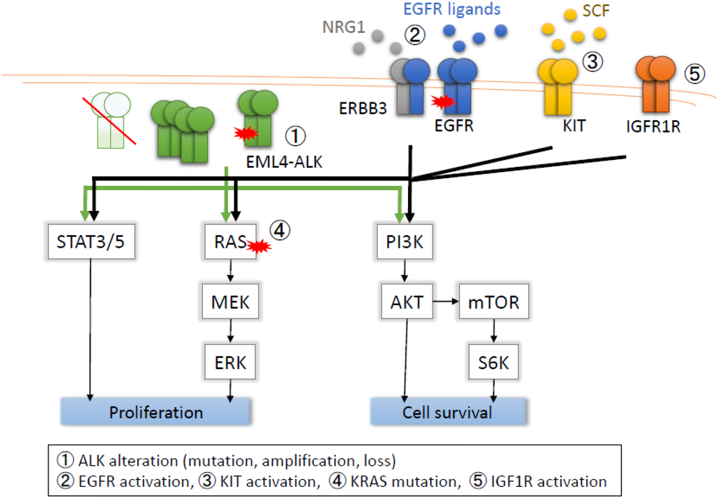 In addition to ALK gene alterations, other mechanisms of resistance to crizotinib include the activation of tyrosine kinase receptors such as EGFR, KRAS, or cKIT. Because these resistance mechanisms partially retain ALK survival signaling (namely the co-activation of ALK and other tyrosine kinase pathways), blocking both pathways is likely required to overcome this resistance. Sasaki et al. detected the secretion of amphiregulin, which is an EGFR ligand, in DFCI076 cells derived from a crizotinib-refractory patient []. DFCI076 cells had no ALK secondary mutations and displayed increased levels of activated EGFR compared with H3122 cells. They also confirmed that the presence of exogenous EGF caused crizotinib resistance in H3122 cells, suggesting that EGFR activation might be induced by increased EGFR ligand levels. Yamada et al. also revealed that paracrine EGFR ligands including EGF, TGF-α, and heparin-binding EGF-like growth factor (HB-EGF) caused crizotinib resistance []. Consistent with this phenomenon, Katayama et al. observed increased levels of EGFR mRNA, amphiregulin, and HER3 ligand (NRG1) in the resistant cells, in which activation of EGFR and HER3 was increased compared with the parental cells []. Four of nine crizotinib-resistant tumors expressed increased levels of phosphorylated EGFR compared with pre-resistant samples. In addition, a preclinical study showed that the combination of crizotinib and EGFR-TKIs might be effective against this resistance [,]. Katayama et al. found that NSCLC with an ALK secondary mutation (1151Tins) expressed activated EGFR []. Thus, the activation of alternative survival signaling pathways could coexist with ALK secondary mutations.