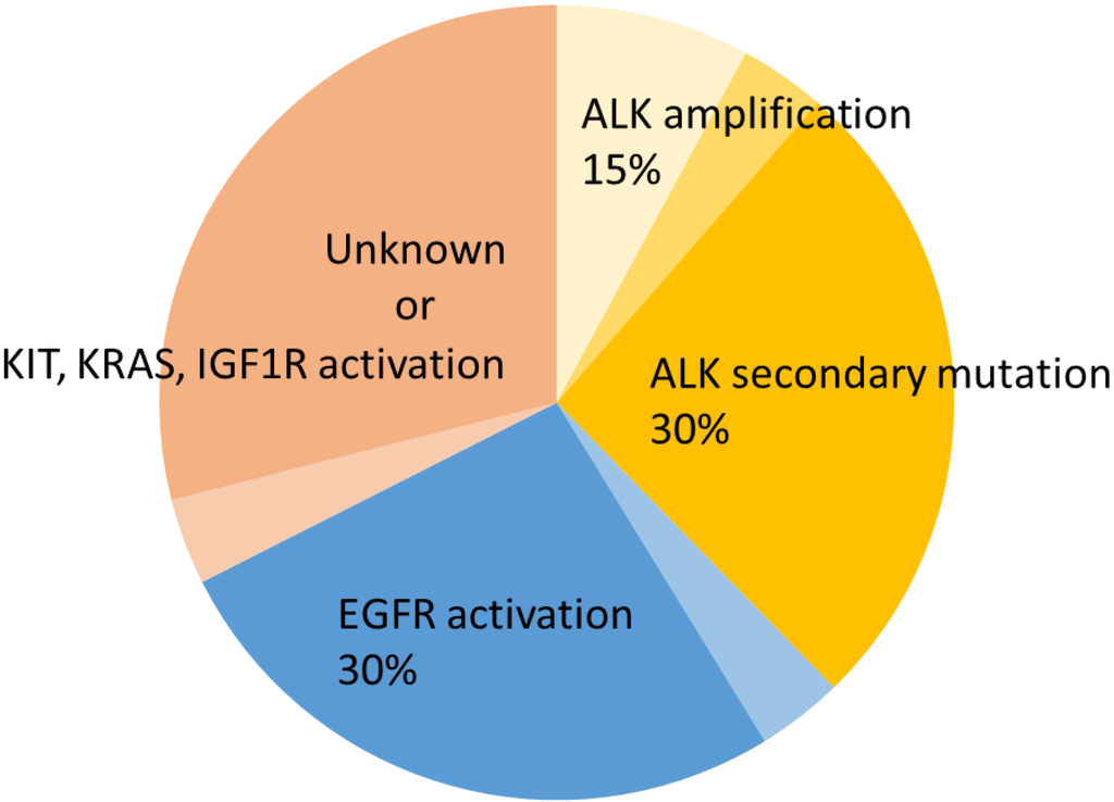 Approximate proportion of crizotinib-resistant mechanisms [,]. ALK secondary mutations include 1151Tins, L1152R, C1156Y, F1174L, L1196M, G1202R, S1206Y, and G1269A.