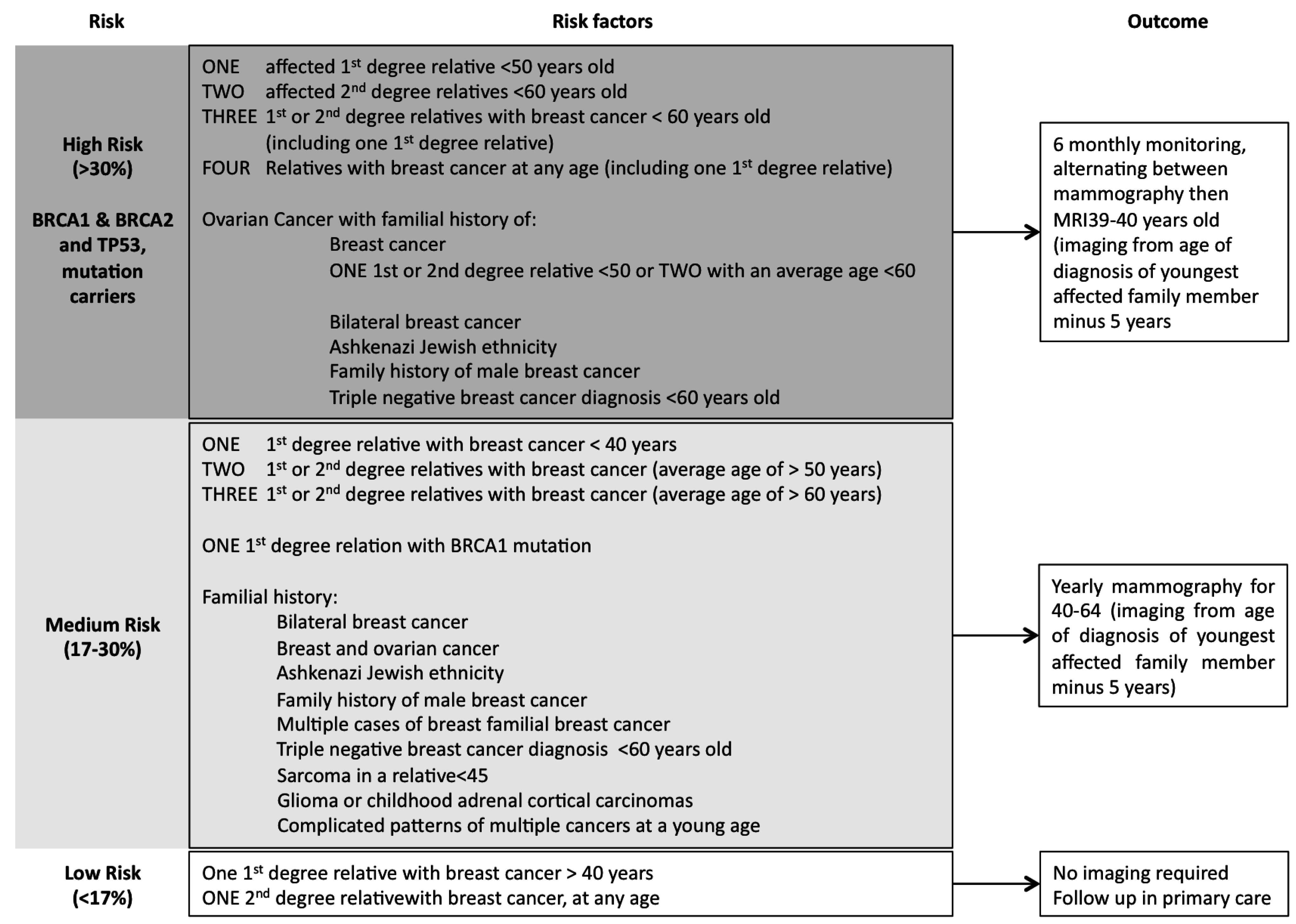 Currently the major genes known to influence breast cancer risk is BRCA1 [60] and BRCA2 [61,62]. These genes are tumour suppressor genes responsible for DNA damage repair [63] and mutations in these genes result in a significantly increased risk of breast cancer. It is estimated that up 16% of all familial breast cancers are due to mutations in these genes [64] and up to 5% of all breast cancer cases [65]. BRCA1 and BRCA2 mutation carriers <70 years old face a 57% and 49% (respectively) risk of developing breast cancer [66]. Importantly, BRCA mutation carriers frequently tend to develop a more aggressive breast cancer and at a younger age [67]. Screening for BRCA gene mutations in high-risk patients has become a priority and scoring systems such as the Manchester scoring system provides a means to identify which patients need increased surveillance [68]. From scoring systems like this, Genetic testing guidelines have recently been introduced for higher-risk patients (Figure 2).