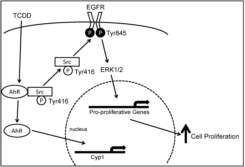 Model depicting molecular mechanisms underlying 2,3,7,8-tetrachlorodibenzo-p-dioxin (TCDD)-induced, Src-mediated activation of the epidermal growth factor receptor (EGFR) signaling in colon epithelial cells. Binding of aryl hydrocarbon receptor (AhR) by ligand, e.g., TCDD, results in phosphorylation of Src kinase at Tyr416 and de-phosphorylation of Src kinase at Tyr527. Activated Src either directly phosphorylates EGFR at Tyr 485 or indirectly activate EGFR through matrix metalloproteinase (MMP) and heparin-binding (HB)EGF, leading to activation of EGFR and downstream ERK1/2 signaling, which stimulates gene transcription and cell proliferation. Binding of AhR by TCDD also causes translocation of AhR from the cytosol to the nucleus where it acts as a transcription factor for CYP1A1 and CYP1B1. Reproduced with permission from G. Xie, Z. Peng and J.P. Raufman. Am. J. Physiol. Gastrointest. Liver Physiol.; published by the American Physiological Society, 2012.