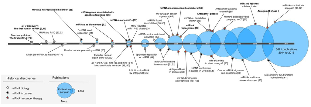Selected historical discoveries that collectively led to transitioning miRNAs into the clinic. The selected hallmarks are divided into miRNA biology, involvement in cancer, and advances in miRNA-based cancer therapeutics. The circles represent the number of publications per single year (PubMed query: miRNA AND cancer; accessed: June 2015). CT: computed tomography.