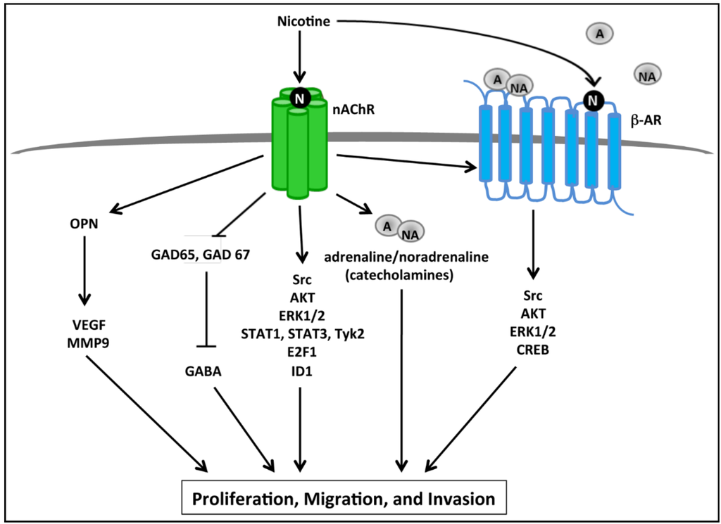 Schematic representing downstream pathways activated by nicotine that promote proliferation, migration, and invasion of pancreatic cancer cells. Activation of nAChRs upon nicotine binding results in the activation of multiple signaling cascades as well as the release of catecholamines such as adrenaline (A) and noradrenaline (NA). Adrenaline and noradrenaline in turn bind to and activate β-adrenergic receptors (β-ARs), resulting in activation of Src kinase, and subsequent activation of AKT, ERK1/2, and CREB leading to enhanced proliferation of pancreatic cancer cells. nAChR stimulation results in increased osteopontin (OPN), which then increases VEGF and MMP9 levels resulting in increased proliferation and migration of pancreatic cancer cells. Similarly, nicotine represses GAD65 and GAD67 enzymes which are responsible for the synthesis of GABA, which typically acts to repress pancreatic cancer cell proliferation, migration, and invasion; therefore nicotine can promote proliferation by suppressing GABA synthesis. Further, nicotine is known to bind to nAChRs and activate Src, AKT, and ERK1/2 signaling proteins, as well as lead to the activation of STAT1, STAT3, E2F1, and ID1 transcription factors, resulting ultimately in increased pancreatic cancer cell proliferation, migration, and invasion.