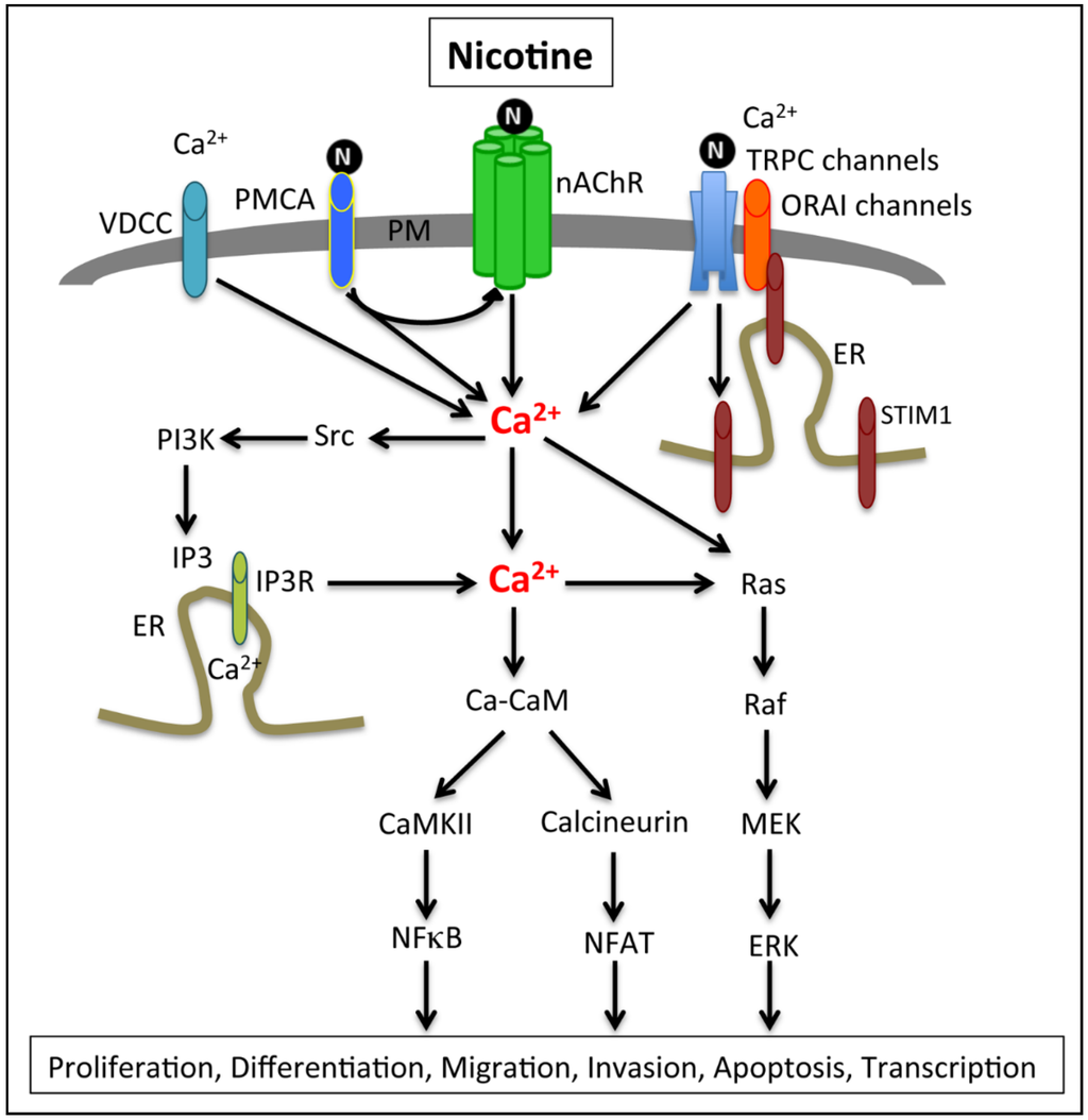 Activation of nAChRs, especially α7-nAChRs, are known to enhance permeability of calcium by directly influencing calcium influx or by activating voltage-dependent calcium channels (VDCC) and by calcium-induced calcium release from endoplasmic reticulum through inositol (1,4,5)-triphosphate receptors (IP3R). Similarly, the plasma membrane calcium ATP-ase (PMCA) activation enhances nAChR-mediated calcium elevations. Furthermore, Src-dependent PI3K activation can enhance IP3 and IP3R-mediated calcium increase and downstream signaling via the Ras-MAPK axis. The increased calcium can also induce calmodulin (CaM)-dependent signaling mechanisms, such as activation of CaM-dependent kinases (CaMKII) or the phosphatase calcineurin. Calcineurin-mediated dephosphorylation of NFAT leads to its nuclear translocation and activation. Nicotine also enhances intracellular calcium levels through activation of the transient receptor potential channels (TRPC), which in turn enhance store operated calcium entry through activation of STIM and ORAI. Studies in PDAC cells have shown that gemcitabine treatment enhances ORAI and STIM activation and their downregulation enhances the gemcitabine-mediated cytotoxicity in cancer cells.