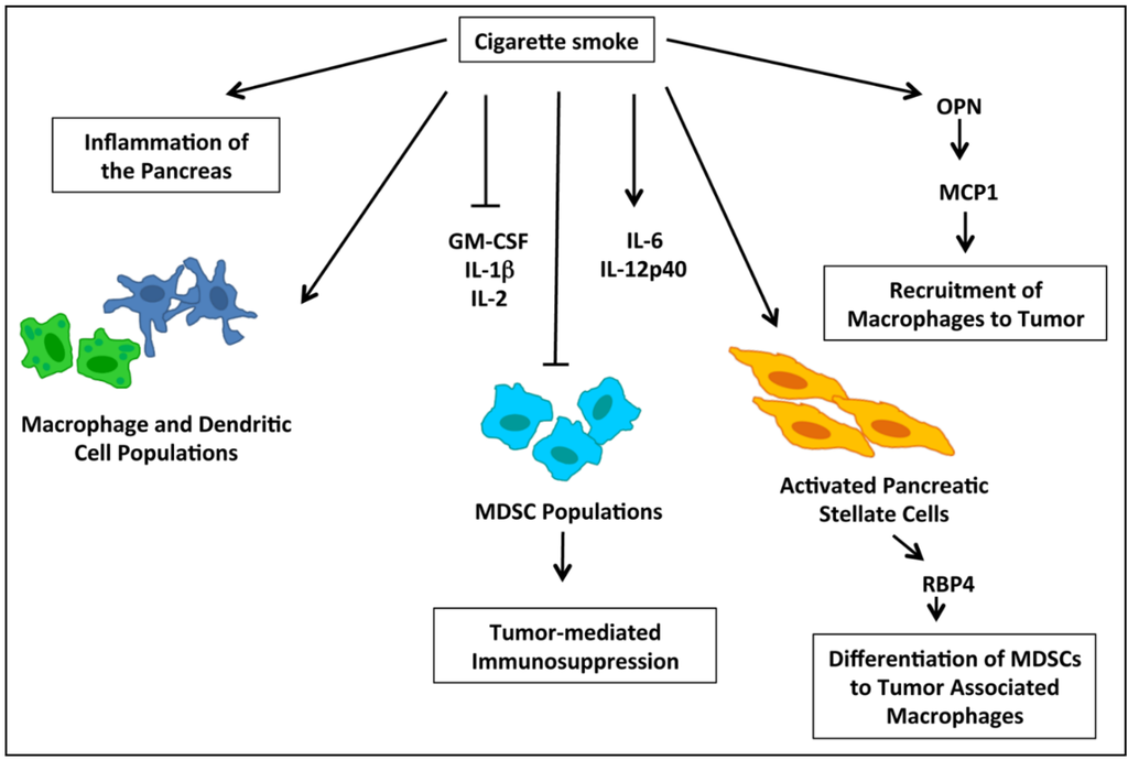 The tumor microenvironment plays a critical role in both the development and progression of cancer, and accumulating evidence has demonstrated the importance of immune response in this context. Myeloid derived suppressor cells (MDSCs) are thought to play a role in tumor-mediated immunosuppression, and are detected in the circulation during pre-neoplastic stages of pancreatic tumor development [117,118]. These cells assist tumors in evading immune surveillance by suppressing T-cells while promoting T-regulatory cell development [118]. Nicotine is known to modulate immune response in other cancer types, specifically lung cancer; and in a recent study using a KRAS G12D model of pancreatic cancer, cigarette smoke was found to reduce systemic accumulation of granulocytic and monocytic MDSCs while increasing macrophage and dendritic cell populations [46]. It was further shown that mice exposed to cigarette smoke had higher levels of the cytokines IL-6 and IL-12p40, while there were reduced levels of GM-CSF, IL-1beta, and IL-2, and no differences were reported for G-CSF, M-CSF, IL-10, IL-13, TGFβ, TNFα, or MIP1α [46]. The molecular events involved in the modulation of the immune response by cigarette smoke are depicted in Figure 3. Cigarette smoke further resulted in increased levels of inflammatory markers in the pancreas associate with overall inflammation of the pancreas, and this was accompanied by an increase in activated pancreatic stellate cells, which secrete serum retinoic acid binding protein 4 which contributes to the differentiation of MDSCs to tumor-associated macrophages (TAMs) [46]. TAMs additionally enhance expression of HB-EGF in pre-neoplastic pancreatic lesions, and this protein is associated with/facilitates acinar-to-ductal metaplasia [46]. In an additional study investigating the impact on inflammation and immune response, nicotine was shown to enhance expression of monocyte-chemoattractant protein 1 (MCP1), which is produced by a number of cell types in the tumor microenvironment and acts to recruit macrophages to tumor sites [119]. Nicotine induction of MCP1 was found to occur through OPN, which is also known to be induced by nicotine [119]. In invasive pancreatic cancer patient samples, MCP1 was found to be expressed in 60% of the cases and the majority of samples assessed were from smokers; further, MCP1 colocalized with OPN in invasive patient tissue samples [119]. Overall, these studies demonstrate that smoking can modulate the immune response to promote tumor growth.