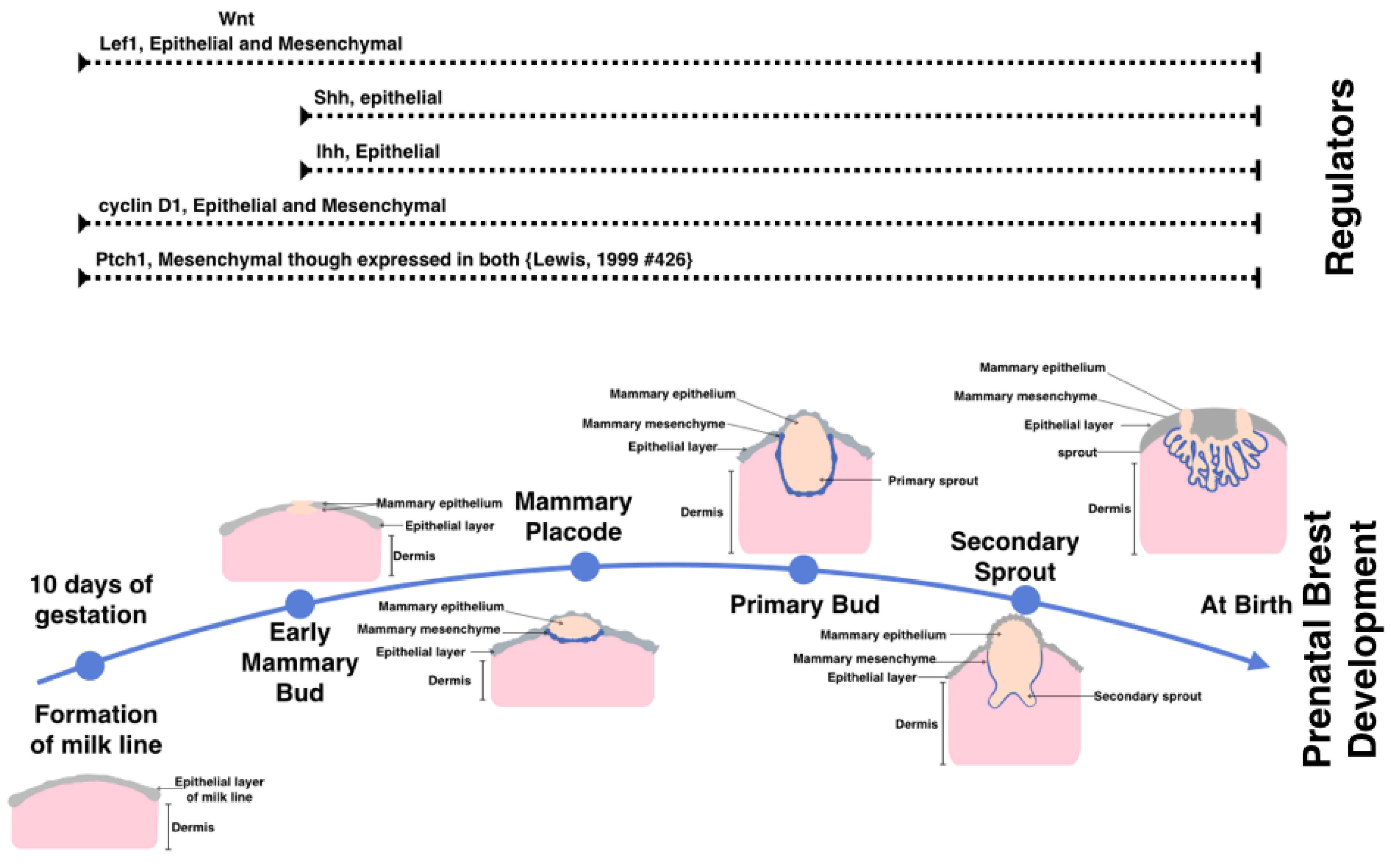 The prenatal stages of mammary gland tissue development. The mammary gland forms as early as day 10 of gestation in mice by the formation of the milk line. This is followed by at least four stages of development. At the time of birth the breast tissue is composed of three distinct layers including the mammary epithelium, mammary mesenchyme. (Which forms the structure of the secondary sprouts), and the dermis. Above are the expression patterns of active signaling and necessary for prenatal mammary gland formation. Illustrated in the top are the hedgehog components associated with those stages of development in mouse embryonic study.