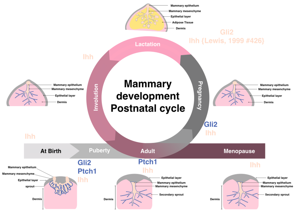 Postnatal mammary gland development is composed of several stages (after birth, puberty, adult, pregnancy, lactation, involution, and menopause). Highlighted are the known key hedgehog signaling components expression found essential at each stage of mammary adult female breast. It should be noted that other Hh components are found expressed at various stages, yet the highlighted compounds are the ones found important for that stage of development.