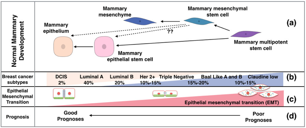 The mammary gland stem cell types and the corresponding breast cancer type. (a) The expansion of breast cell types from a single progenitor; (b) The molecular sub classification of breast cancers, their hypothesized origin, and percentage prevalence at clinical presentation; (c) The involvement of EMT process in breast cancer and a suggested level of EMT according to the sub classification of breast cancer; (d) The associated prognosis of various breast cancer subtypes.