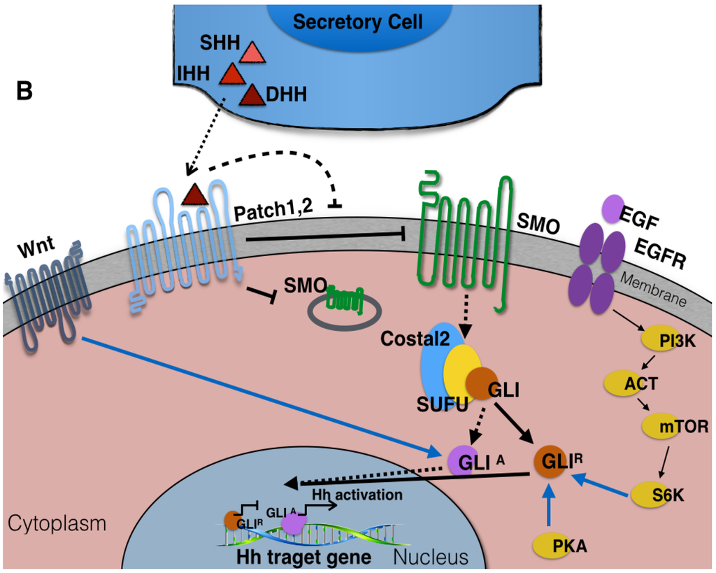 In addition to the canonical Hh signaling pathway, a non-canonical Hh pathway was recently reported [16,17]. This alternate mechanism involves activation of the hedgehog pathway components by other signaling cascades such as that associated with the epidermal growth factor receptor (Figure 4B).