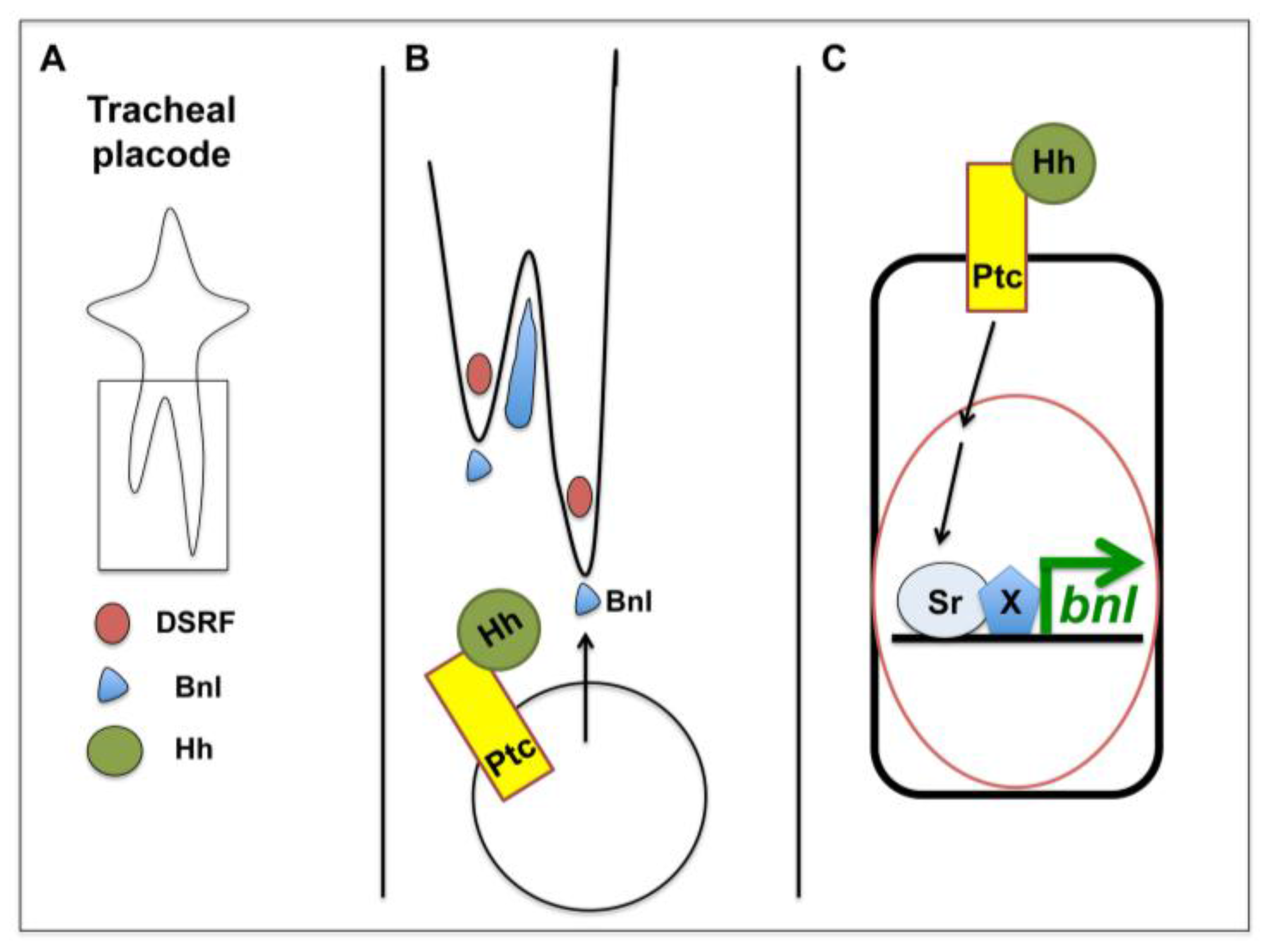 Hh in tracheal cell migration. Schematic representation of one tracheal placode at stage 13; (B) detail of (A), showing the tip cells of each branch and how Bnl is expressed in the surrounding tissues in order to provide a chemoattractive signal; and (C) how canonical Hh signaling induces the expression of Bnl in the cells surrounding the tracheal tip cells (adapted from [45]).