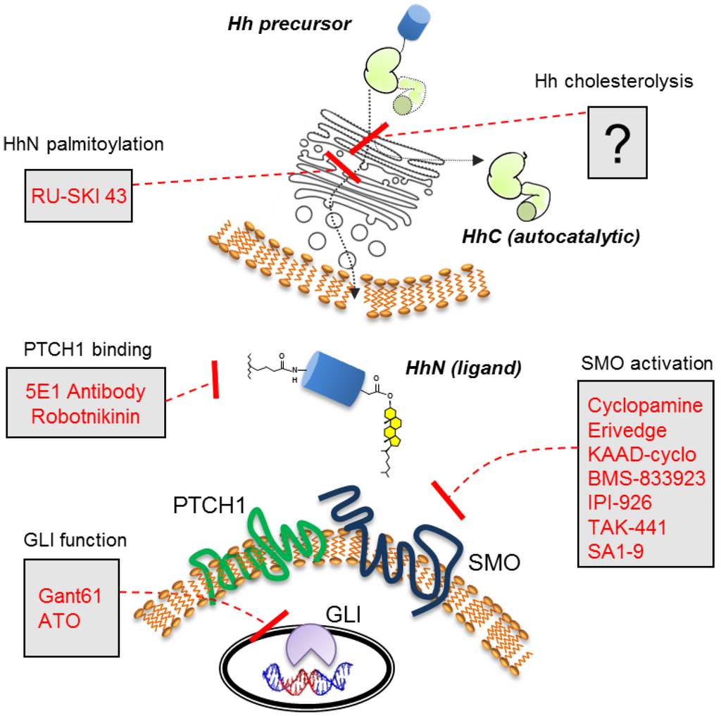 Components and selected antagonists of the Hh cell-cell signaling pathway. Hh precursor cholesterolysis occurs in the endoplasmic reticulum of the Hh expressing cell (top).