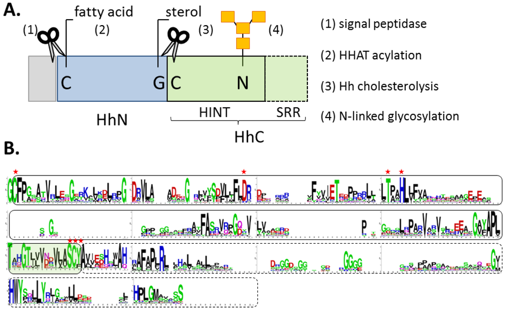 (A) Block diagram of Hh precursor protein, with signal peptide (grey), signaling ligand (blue), and autocatalytic segment (green). (B) Conserved residues in the autocatalytic segment displayed by Logoplot (http://weblogo.berkeley.edu/logo.cgi). Solid line delineates the HINT domain; hashed line, the SRR region. Residues marked with red asterisks are required for cholesterolysis.