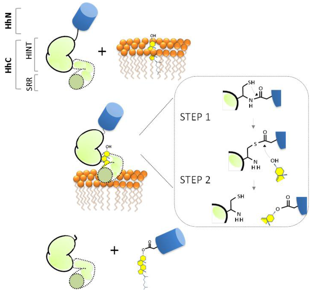 Hh proteins are expressed as bifunctional precursors, consisting of the signaling ligand (HhN, 20 kDa) fused to a C-terminal autocatalytic element (HhC, 26 kDa) (Figure 2A). Early studies demonstrated that Hh precursor is short lived in eukaryotic cells, undergoing site-specific cleavage to separate HhN from HhC [39,40]. Beachy and his group revealed two surprising features of this reaction: first, the transformation can be reconstituted in vitro in the absence of accessory proteins; second, the terminal nucleophile that cleaves at the HhN/HhC junction is a sterol [38,39,50]. Cholesterol proved to be most active in the reconstitution experiments, and presumably represents the native substrate in mammals. Thus, a new post-translational modification was discovered that proceeds by peptide bond cholesterolysis [38,51]. Remarkably, two decades from those seminal publications, members of the Hh family still seem to retain “exclusive rights” to this chemistry [53].