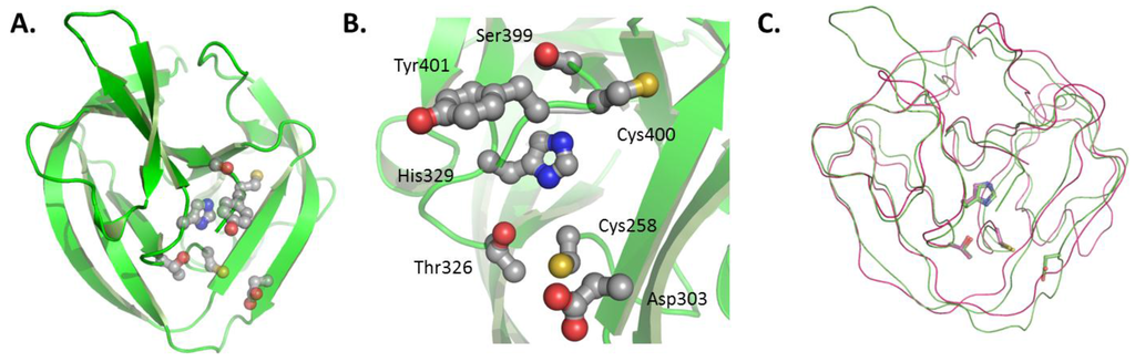 The first, and so far only, structure relevant to HhC is that of a HINT domain reported by Hall et al. in 1997 [53]. The domain belongs to the Drosophila melanogaster (Dme) Hh precursor. It is competent to self-catalyze the first step of cholesterolysis, N-S acyl shift, but not the second. Thus, the domain can generate an internal thioester, as apparent from cleavage at the N-terminal HINT junction by water (hydrolysis) and added hydroxylamine (hydroxyaminolysis); however, activity with cholesterol is absent. The HINT domain is predominately β-strand, folded into two symmetrical lobes resembling a baseball catcher’s glove (Figure 4A). Active site residues are arranged in the glove’s pocket (Figure 4B). Striking homology exists between the HINT structure and the self-splicing domain of inteins, pointing to a common ancestor (Figure 4C) [47,53,60]. Catalytic residues in common between Hh HINT and inteins comprise the N-terminal cysteine, a conserved TXXH motif, and second cysteine at the C-terminal end of the domain. Evolutionary divergence is apparent in, for example, an active-site aspartate (Asp303 in full length Dme Hh numbering).