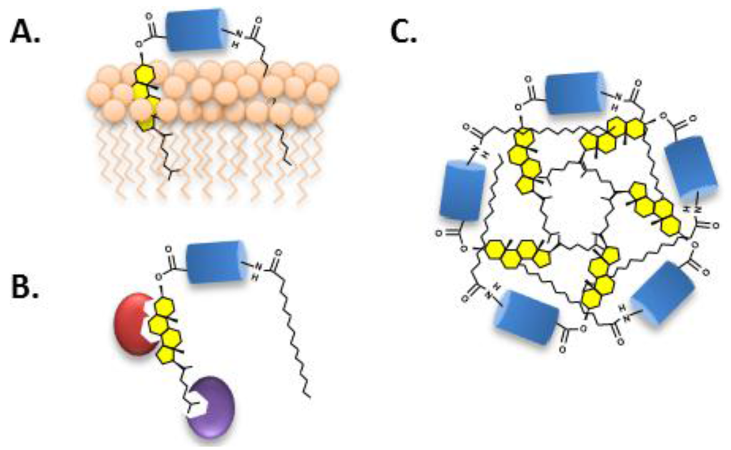 (A) Cholesterol targets soluble Hh ligand to cell membranes; (B) Proteins associate with Hh ligand via cholesterol; and (C) Micellization of the Hh ligand stabilized by hydrophobic interactions of the attached lipids.