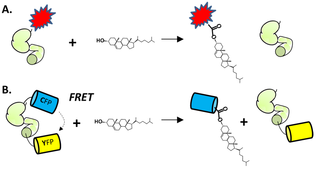 (A) Cholesterolysis assay using HhC (green) fused to the FLaSH, peptide-dye complex (red). (B) Cholesterolysis assay using HhC fused to cyan and yellow fluorescent proteins.