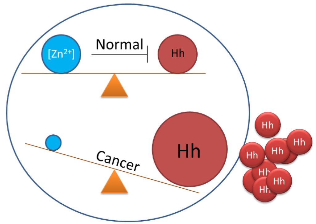 Proposed balancing of Hedgehog biosynthesis by cellular zinc concentrations and disruption in cancer.