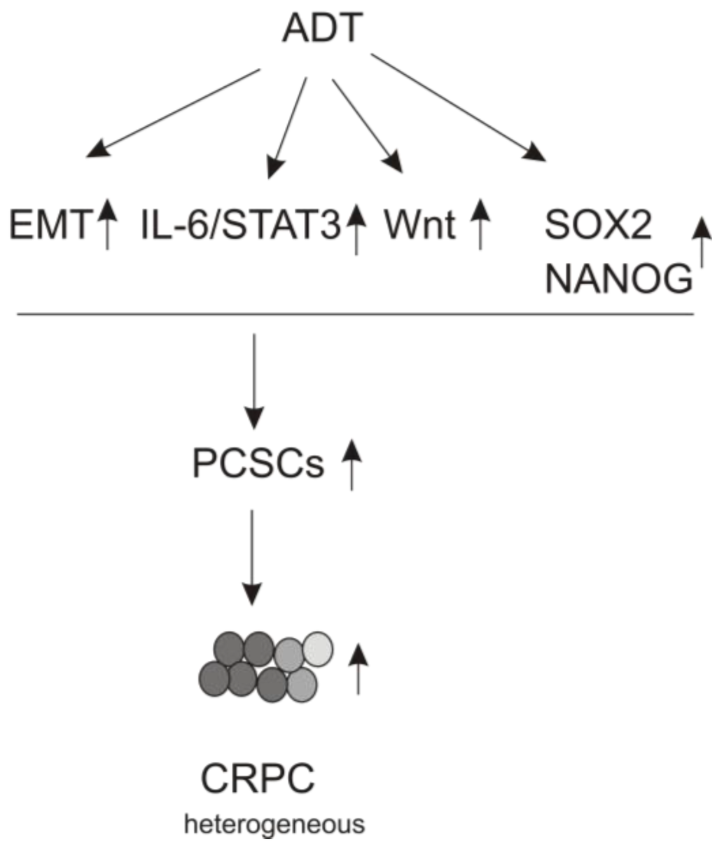 Multiple lines of evidence support the notion that PCSLCs play important roles in resistance acquisition to anti-androgen therapies. The development of resistance towards ADT, enzalutamide or abiraterone is regulated by PC’s ability to evolve, a trait of PCSLCs. It is commonly recognized that among tumor’s heterogeneous cell populations [,,], cancer stem cells (CSCs) are the units of evolutionary selection [,,]. This is more relevant with respect to therapy-induced resistance. CSCs possess intrinsic resistance to therapy-induced cytotoxicity [,] and are able to evolve following the selective pressure derived from treatments []. For example, PCSLCs are significantly more resistant than their non-cancer stem cell counterparts towards etoposide- and γ-irradiation-induced DNA damage [,]. This plasticity of CSCs in directing tumor recurrence is shared by their tissue stem cell counterparts during tissue regeneration [,]. Akin to orchiectomy that leads to robust prostate involution, ADT results in marked PC regression. Both prostate stem cells (PSCs) and PCSLCs are androgen-independent. While PSCs regenerate the prostate, PCSLCs produce recurrent CRPCs [,]. The signatures of PCSLCs are associated with poor prognosis [,].