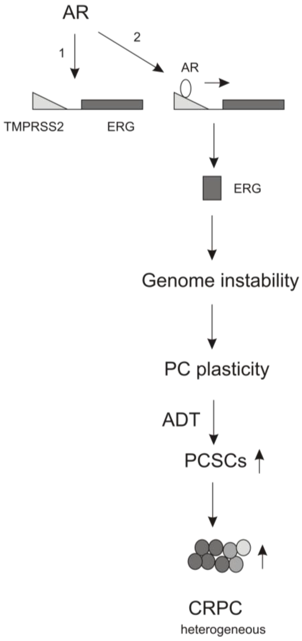 While AR maintains the normal functions of prostate and promotes prostatic epithelial cell differentiation [], its roles in PC tumorigenesis are likely different. For example, evidence supports a direct role of AR in promoting the recurrent gene fusion involving the ETS family of transcriptional factors ERG and ETV (TMPRSS2-ERG and TMPRSS2-ETV1) in PC []. It has been observed that androgen induced the recruitment of AR and topoisomerase IIβ (TOP2β) to TMPRSS2-ERG genomic breakpoints, which led to the generation of TOP2β-mediated DNA double stranded breaks and the subsequent genomic fusion []. Additionally, AR mediates the expression of these fusion genes [] and ERG subsequently promotes genome instability [,]. Collectively, AR may play a role in genome instability, which contributes to PC plasticity and indirectly facilitates PCSLC expansion in response to ADT (Figure 2). This model considers AR’s role in promoting PC progression and supports the clinical observation that ADT is more efficacious to PCs at early stages []. This model is also in line with the well-accepted concept that AR signaling is an important contributor to CRPC evolution under ADT.