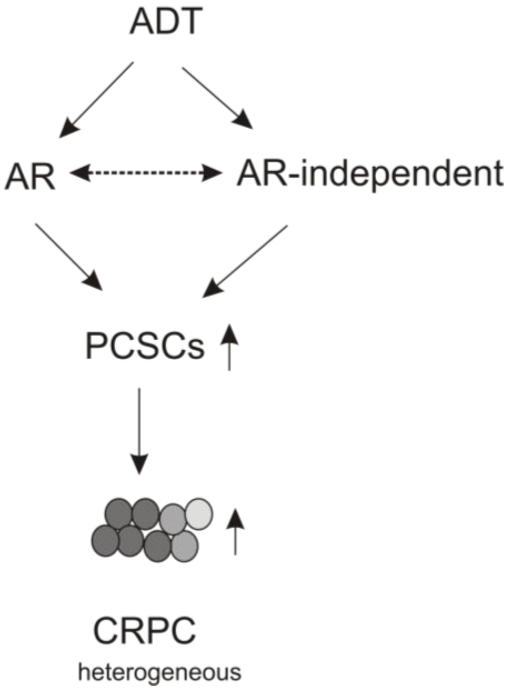 Despite intensive research for mechanisms leading to CRPC in the past few decades, our understanding remains limited. Nonetheless, it has been noted that persistent AR signaling under ADT levels of serum testosterone (<50 ng/mL) clearly contributes to CRPC, as evident by the short-term survival advantage offered by abiraterone and enzalutamide in CRPC patients [,]. However, it is equally clear that AR signaling is not the only contributor and thus, targeting AR alone is unlikely to eliminate CRPC. ADT causes complex alterations within tumors in terms of factors and pathways as well as its epigenetics and genetics. As well, ADT also affects tumor microenvironment. These complex alterations might be particularly relevant to abiraterone and enzalutamide-caused resistance. While resistance to ADT develops in a medium of 12–18 months [], resistance to abiraterone and enzalutamide occurs within 5.6 and 8.8 months, respectively [,]. One strong support for a critical role of AR signaling in resistance acquisition to the new anti-androgens is the involving AR-V7 or AR3, a constitutively active AR mutant []. In view of AR-V7 overexpression promotes PCSLC in both AR-positive and -negative PC cells [], it calls for precaution whether PCSLC expansion should be given an equal emphasis to persistent AR signaling (transcriptional activity) in developing resistance to ADT and the second generation anti-androgens. Furthermore, the intratumoral heterogeneity in AR expression is likely associated with different AR function, which could contribute to PCSLC expansion in response to ADT. With this consideration, it is tempting to propose a model in which ADT results in AR-involved and AR-independent enhancement of PCSLC expansion and the subsequent CRPC acquisition (Figure 3).