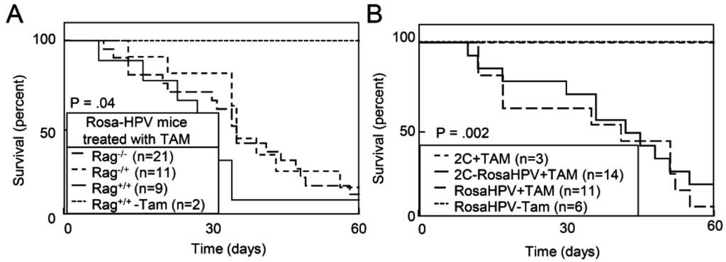 Since Rosa-HPV mice induced expression of the HPV oncogenes E6 and E7, as well as a luciferase reporter, we excluded the possibility that these induced proteins served as neoantigens stimulating lethal autoimmune responses. We bred Rosa-HPV mice to Rag1−/− mice in order to generate T cell- and B cell-deficient mice (RosaHPV-Rag1−/−). In addition, we bred Rosa-HPV mice to a 2C TCR transgenic mice [25] where greater than 90% of T cells are specific against an α-Ketoglutarate dehydrogenase self-antigen (RosaHPV-2C) resulting in a functionally immunodeficient state [26]. TAM treatment caused similar decreases in survival for RosaHPV-Rag1+/+, RosaHPV-Rag1+/− and RosaHPV-Rag1−/− mice (Figure 2A). Similarly, TAM treatment caused similar decreases in survival for RosaHPV and RosaHPV-2C mice (Figure 2B). Therefore, the decreased survival caused by HPV oncogene expression was not explained by immune responses generated against induced antigens.